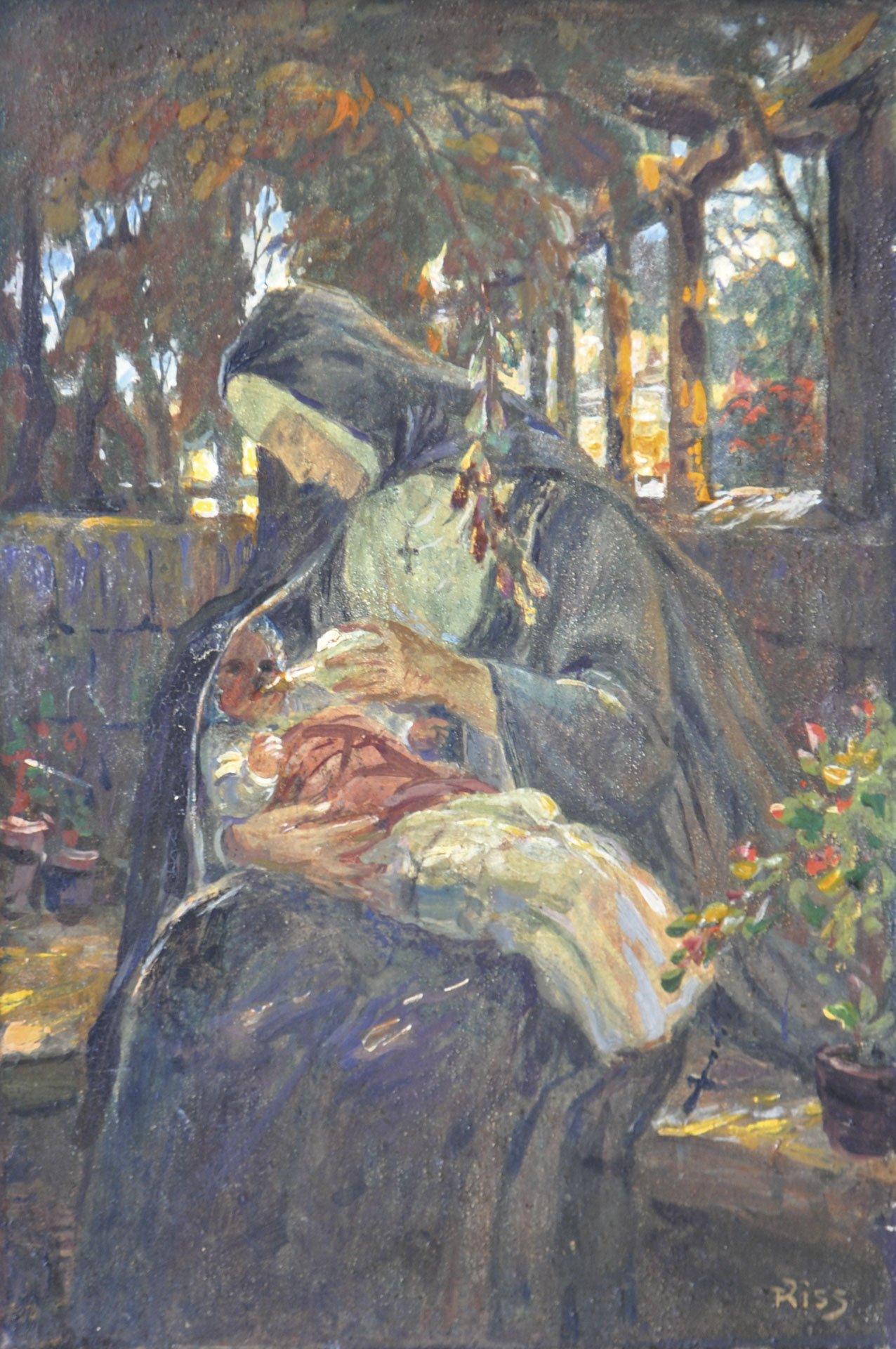 Thomas Riss (Haslach, Stams 1871 – Innsbruck 1959) Giardino di un ospizio per trovatelli;Olio su cartone, 33 x 24,5 cm, in cornice