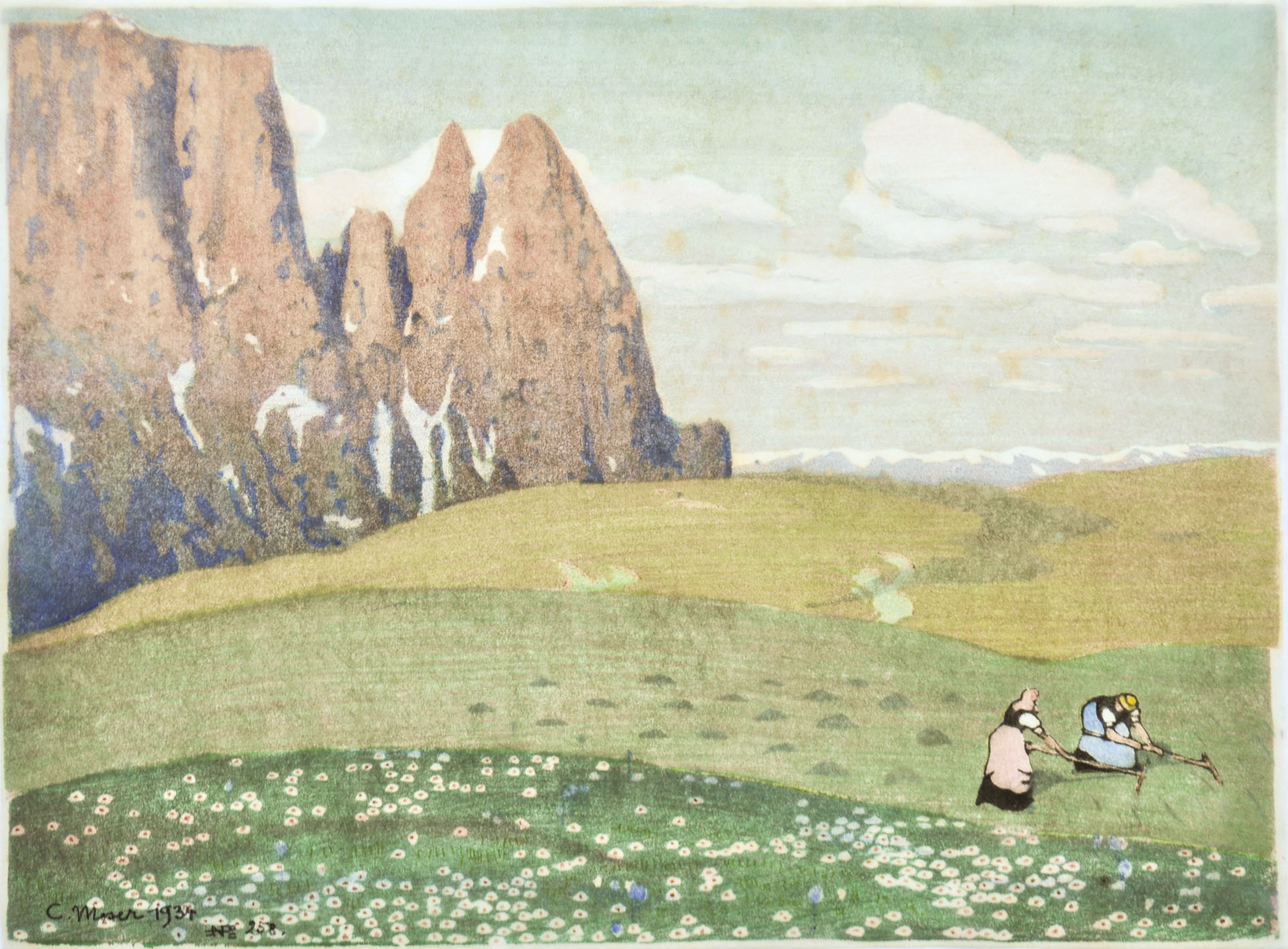 Carl Moser (Bozen/Bolzano 1873 – 1939) Sciliar con Alpe di Siusi, 1934;Xilografia a colori, 38,7 x 52,3 cm