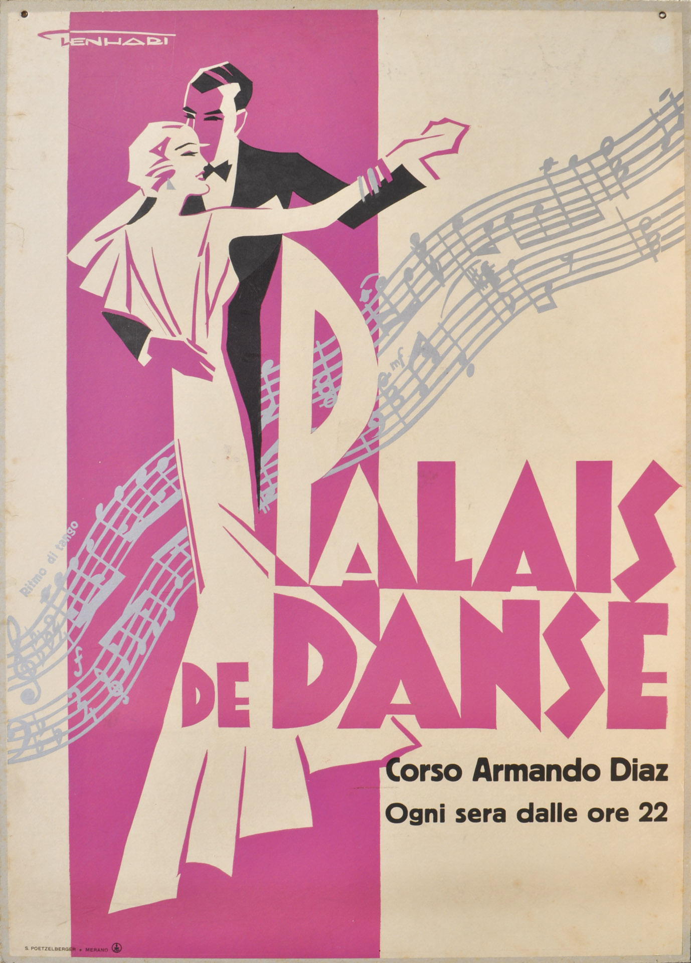 Franz Lenhart (Bad Häring 1898 – Meran/Merano 1992) Manifesto “Palais de danse – Corso Armando Diaz“, 1930 ca.;Stampa su carta montata su cartone, 94 x 67 cm, strappi