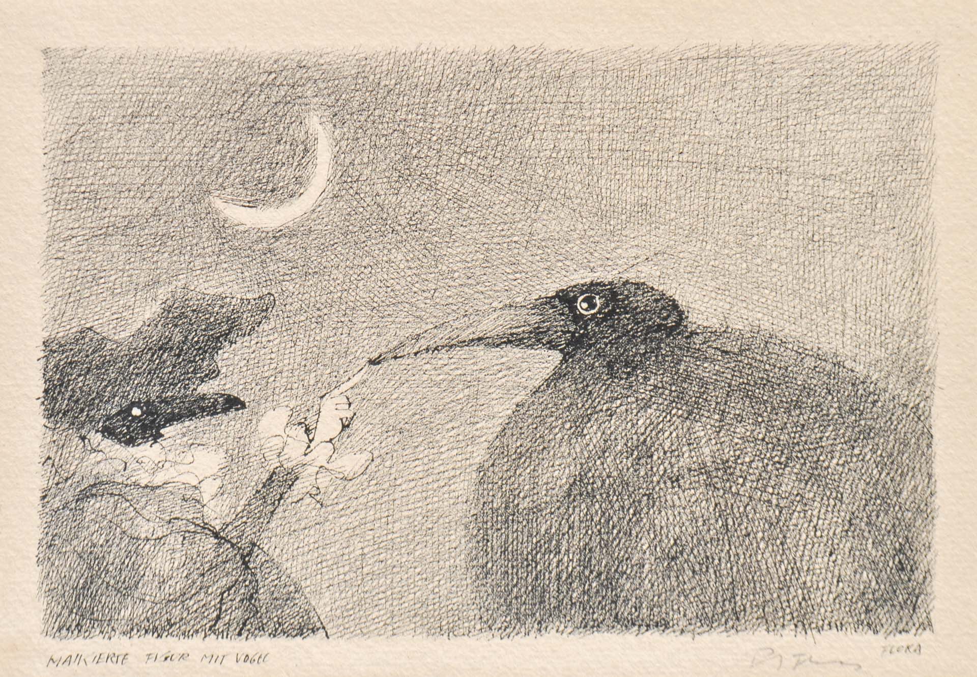 Paul Flora (Glurns/Glorenza 1922 – Innsbruck 2009 Figura mascherata con uccello;China, 13,7 x 19,7 cm (entro il passepartout)