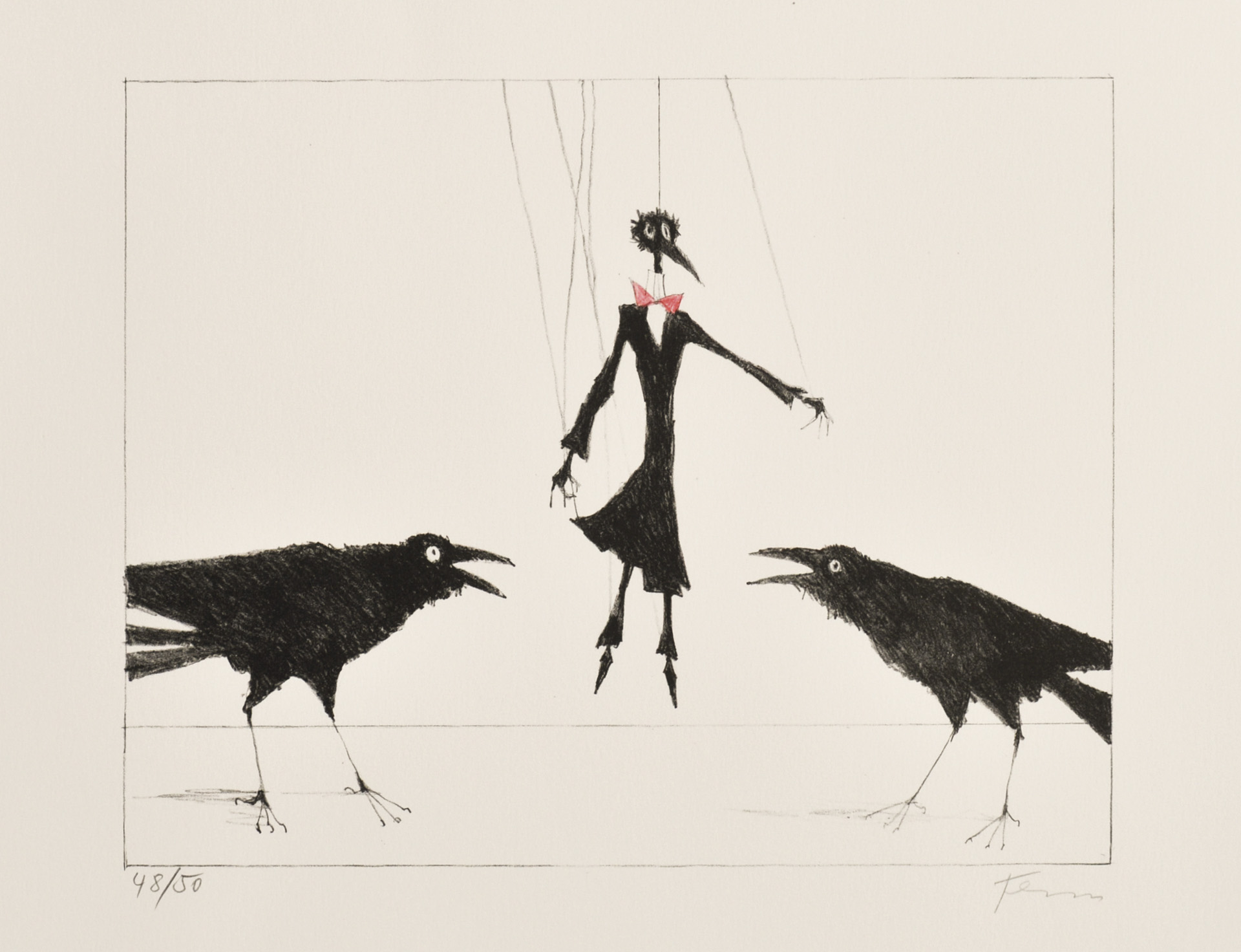 Paul Flora (Glurns/Glorenza 1922 – Innsbruck 2009) Marionetta e due corvi, 2007;Litografia, 34,9 x 44,9 cm