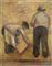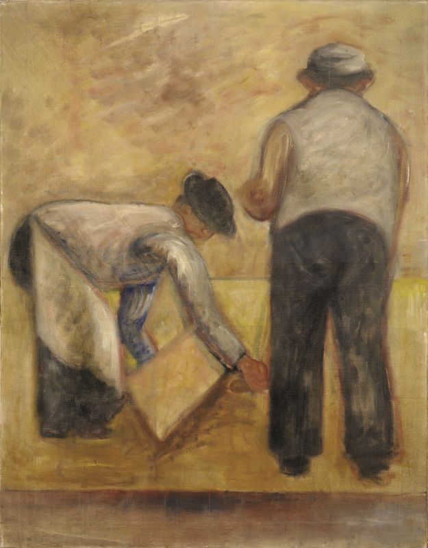 Ottone Rosai Firenze 1895 - Ivrea (To) 1957 I lastricatori, (1955) Olio su tela, cm. 155,6x120,6 Al verso sulla tela: quattro timbri ed etichetta Eredità Rosai con data 31/5/57: etichetta Campaiola / Studio d'Arte dal 1964, con dati dell'opera (datata 1955); sul telaio: timbro Studio d'Arte Campaiola, Roma. Certificato su foto di Luigi Cavallo, Milano, 8 febbraio 1990. Esposizioni Da Picasso a Botero. Capolavori dell'arte del Novecento, Arezzo, Museo Civico d'Arte Moderna e Contemporanea, 26 marzo - 6 giugno 2004, cat. p. 287, illustrato.