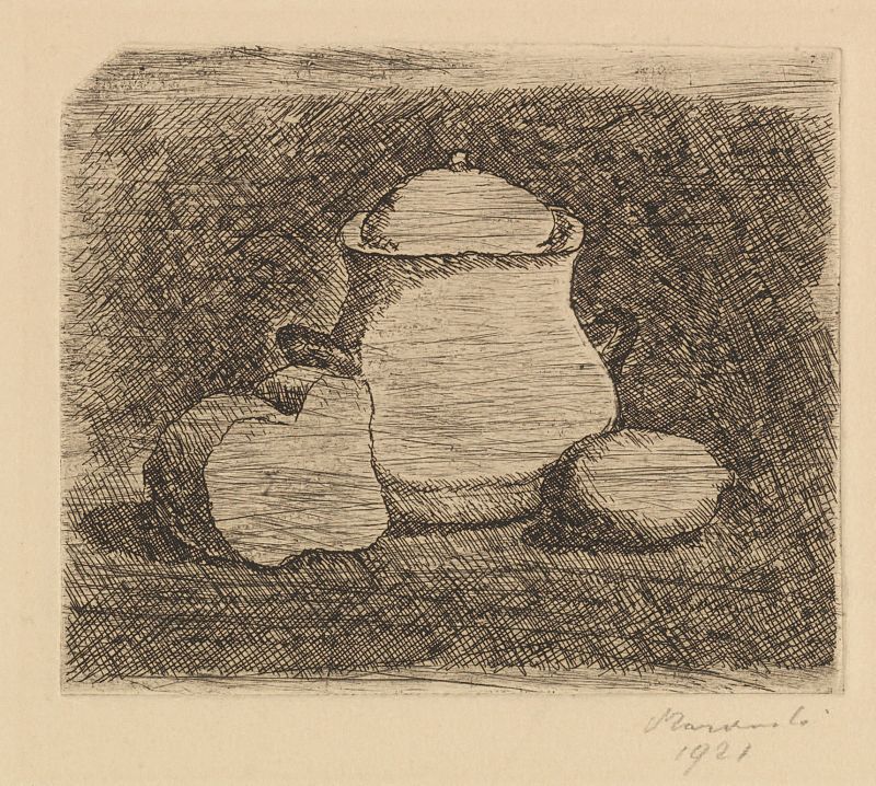 Giorgio Morandi Bologna 1890 - 1964 Natura morta con zuccheriera, limone e pane, 1921 Acquaforte su rame, cm. 8,4x10,1 (lastra), cm. 19,2x25,5 (carta) Firma e data a matita sul margine in basso a destra: Morandi / 1921: timbro a secco Libreria Prandi, Reggio E. Primo stato su due; tiratura di alcuni esemplari non numerati, di cui alcuni su carta Giappone. Bibliografia Lamberto Vitali, L'opera grafica di Giorgio Morandi, Giulio Einaudi Editore, Torino, 1964, n. 9; Michele Cordaro, Morandi incisioni. Catalogo Generale, Edizioni Electa, Milano, 1991, p. 10, n. 1921 4.