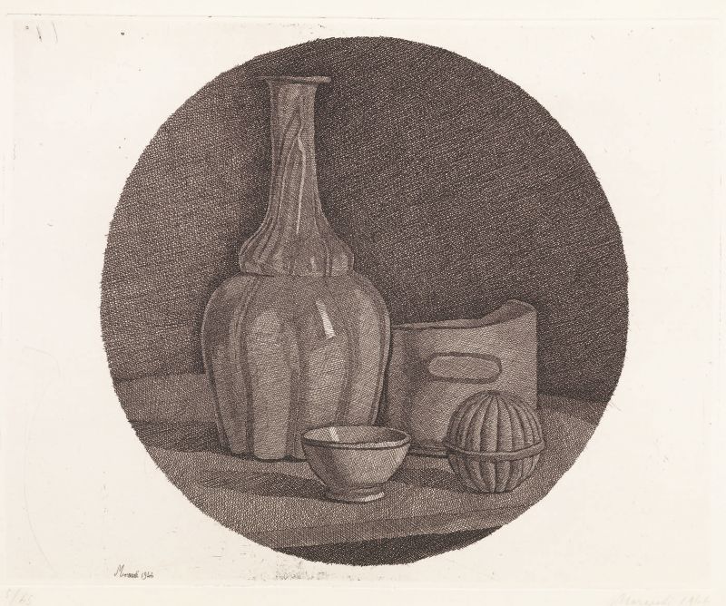 Giorgio Morandi Bologna 1890 - 1964 Grande natura morta circolare con bottiglia e tre oggetti, 1946 Acquaforte su rame, es. 5/65, cm. 25,8x32,5 (lastra), cm. 34,8x50,9 (carta) Firma e data in lastra in basso a sinistra: Morandi 1946, tiratura a matita sul margine in basso a sinistra: 5/65, firma e data in basso a destra: Morandi 1946: timbro a secco Libreria Prandi / Reggio E. Primo stato su due: tiratura di 65 esemplari numerati, di cui qualcuno su carta Giappone, ed alcune prove di stampa. Bibliografia Lamberto Vitali, L'opera grafica di Giorgio Morandi, Giulio Einaudi Editore, Torino, 1964, n. 113; Michele Cordaro, Morandi incisioni. Catalogo Generale, Edizioni Electa, Milano, 1991, p. 131, n. 1946 1.