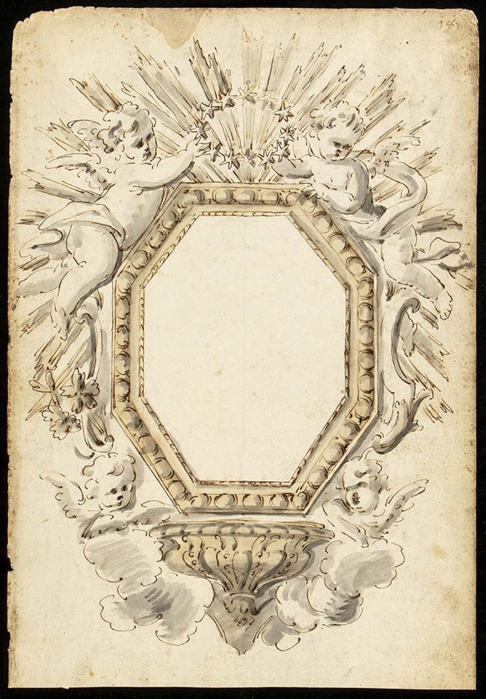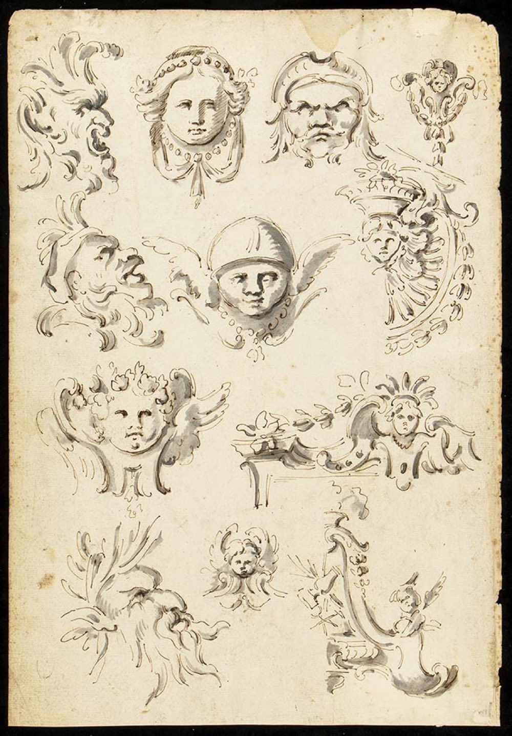 Recto: elemento architettonico a cornice con putti e mensola - Verso: studi di mascheroni ed elementi decorativi vari