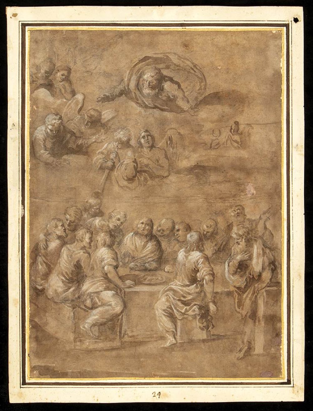 Matita nera, acquerello e biacca su carta bruna, cm. 39,5x28,5
