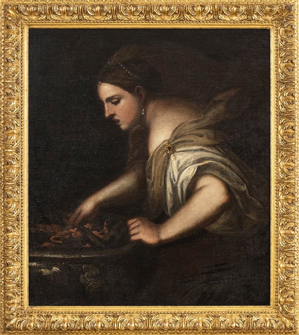 La tela rappresenta un soggetto particolarmente raro che ben incarna il filone filosofico, in chiave stoica, della pittura italiana del Seicento. Figlia di Marco Porcio Catone e moglie di Marco Giunio Bruto, Porzia, in linea con gli ideali del padre e del marito, votò la propria vita alla lotta contro il potere crescente di Giulio Cesare. A seguito delle Idi di Marzo, Porzia fu costretta a fuggire da Roma insieme al marito, prima ad Anzio e successivamente a Napoli. Costretta a rientrare a Roma, Porzia divenne il simbolo della resistenza contro la tirannia e la sottomissione finchè, appresa la morte del marito a Filippi, si suicidò inghiottendo dei carboni ardenti.