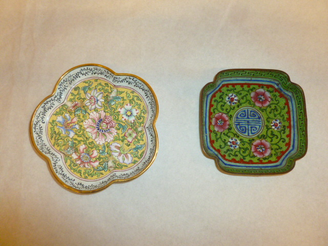 Due piattini, Cina, sec. XIX-XX, in metallo smaltato, decorati con motivi...