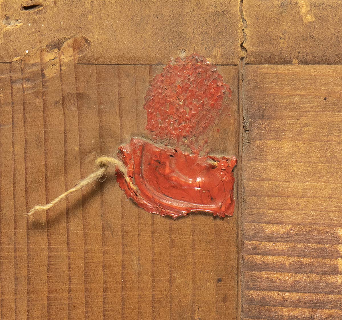 La tela reca al retro sul telaio bollo in cera lacca e due etichette: "APPART. A D[ON]NA LUIS. / SFORZA ERED. DON BOSIO SFORZA (...): ANNO / 1900" e "PROPRIETà DI S.E. / IL SIG. DI BOSIO SFORZA / CONTE DI S[ANT]A FIORA / PROVENIENTE DALL'EREDITà DEL CONTE SFOZA TENERES(?) / 44".