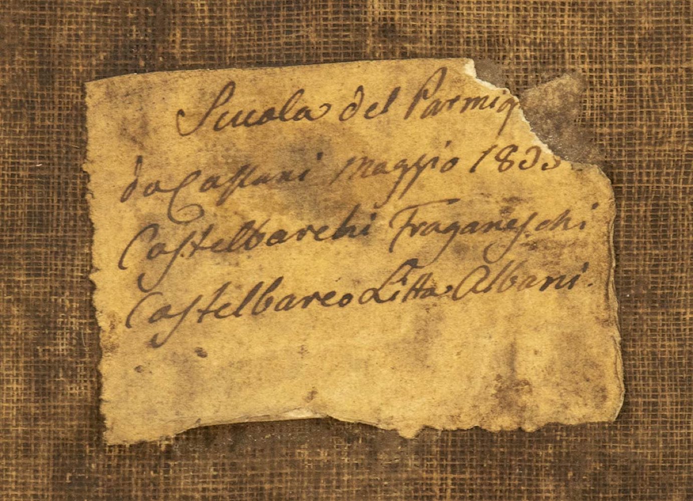 Reca al retro antico cartiglio con iscrizione a penna: "SCUOLA DEL PARMIG[IANINO] / DA CAPPONI MAGGIO 1809(?) / CASTELBARCHI FRAGONESCHI / CASTELBARCO LITTA ALBANI."