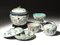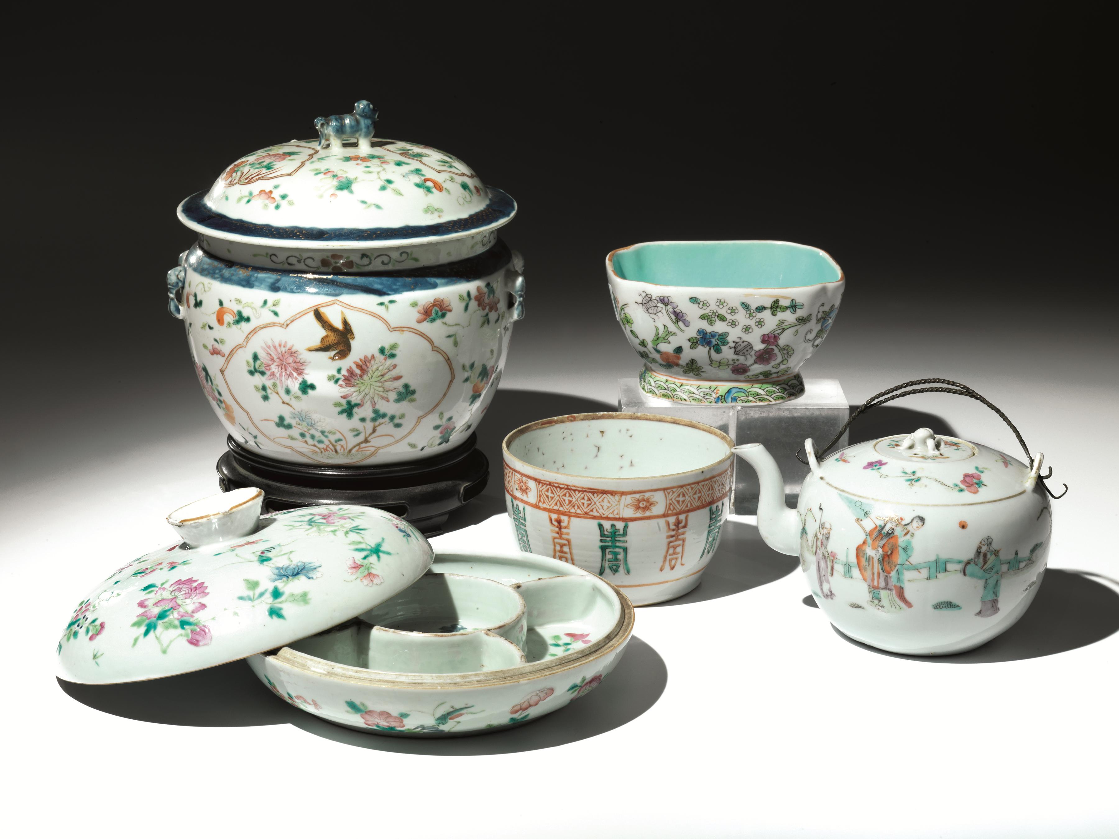 Due contenitori, Cina sec. XIX -XX, in porcellana policroma, uno dalla forma circolare schiacciata decorato con motivi floreali con l'interno diviso in sezioni, diam. cm 18,5, l'altro decorato con motivi floreali, sul coperchio il pomello sagomato come piccolo cane di Phò, alt. cm 18, su base in legno alt. cm 4 (2)