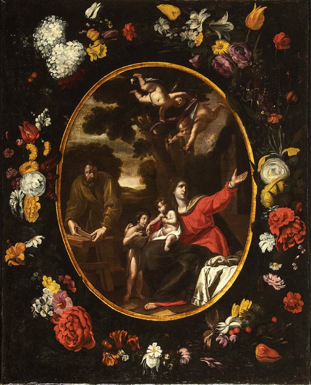 Ghirlanda di fiori con Sacra Famiglia, San Giovannino e angeli