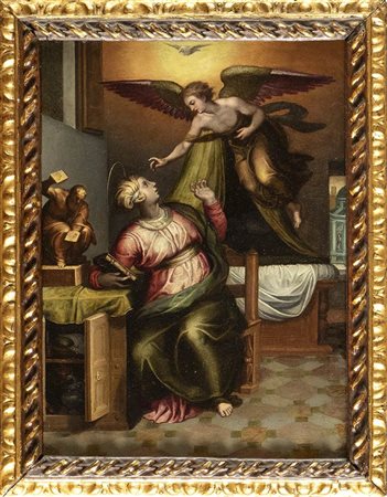 Il dipinto è stato ritenuto autografo del Venusti dal Prof. Massimo Pirondini. Com'è noto, questa superba composizione deriva nelle due figure principali da un disegno di Michelangelo, oggi conservato alla Morgan Library di New York, che doveva fungere da "cartonetto" per una perduta pala d'altare commissionata a Venusti dal Cardinal Cesi e destinata alla chiesa romana di Santa Maria della Pace. La versione pittorica più nota e generalmente ritenuta autografa di Venusti è quella, su tavola, oggi alla Galleria Nazionale di Palazzo Corsini. La nostra versione, di qualità altrettanto alta, si presenta in tutto simile a quest'ultima, con varianti veramente minime, anche se non del tutto trascurabili: in particolare segnaliamo che le ali della colomba dello Spirito santo sono qui totalmente visibili, restando perfino un po' di luce prima del vertice del supporto (cosa che non si verifica nel dipinto Corsini), e che il profilo del tempietto sullo sfondo appare più nitido e delineato nel nostro dipinto, dove risulta anche leggibile una scultura a figura intera entro l'unica nicchia visibile dall'apertura della porte all'estremità destra della composizione. BIBLIOGRAFIA DI CONFRONTO: Intorno a Marcello Venusti, a cura di B. Agosti e G. Leone, Soveria Mannelli 2016; Michelangelo a colori, cat. della mostra, a cura di F. Parrilla, con la collaborazione di M. Pirondini, Roma, 2019 - 2020.