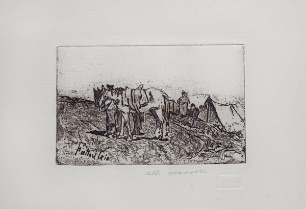 Giovanni Fattori (Livorno, 1825 - Firenze, 1908) ALLE MANOVRE Acquaforte, mm. 225x275 (foglio); mm. 90x140 (lastra) Firma in lastra in basso a sinistra; timbro a secco del Centenario in basso a destra.