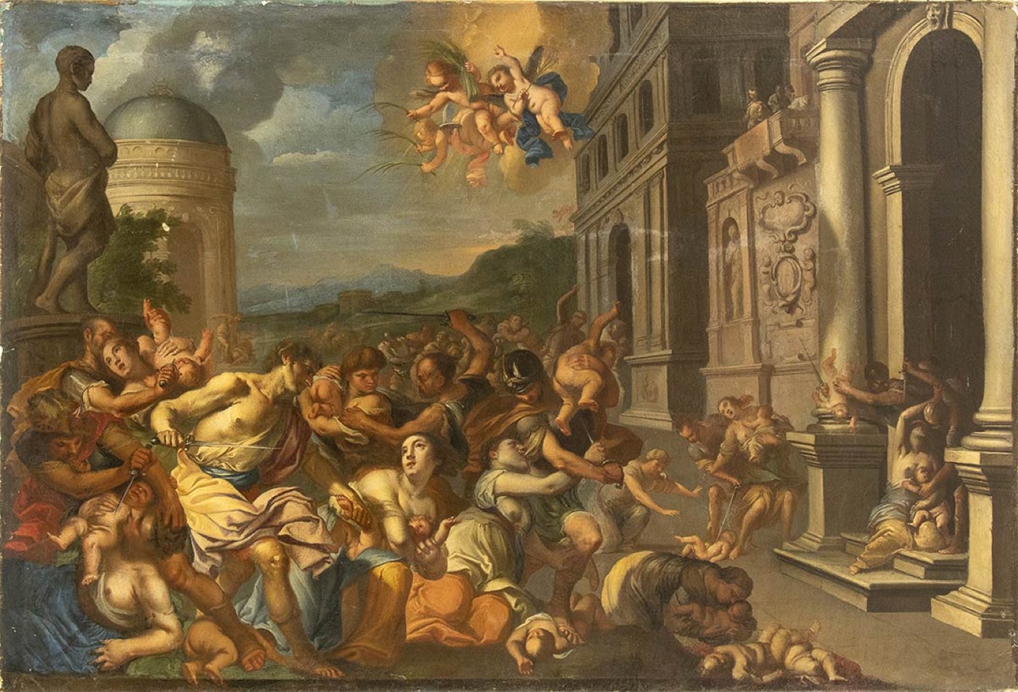 Questa raffigurazione della Strage degli innocenti mostra una composizione particolarmente calibrata ed elegante, pur se dinamica e affollata come si conviene al soggetto. La tela mostra il classicismo, il rigore strutturale, la sapienza nel disegno e nell'articolazione degli spazi che derivano dall'esempio di Carlo Maratti, non senza una certa apertura in direzione cortonesca: caratteri che si apprezzano in molti degli allievi e collaboratori del Maratti e in particolare in Niccolò Berrettoni (Macerata Feltria, 1637 - Rome, 1682), al quale si può avvicinare la nostra tela come suggerisce il confronto con sue opere, quali, ad esempio, il Miracolo di San Filippo Benizi bambino del Convento di San Marcello al Corso in Roma.