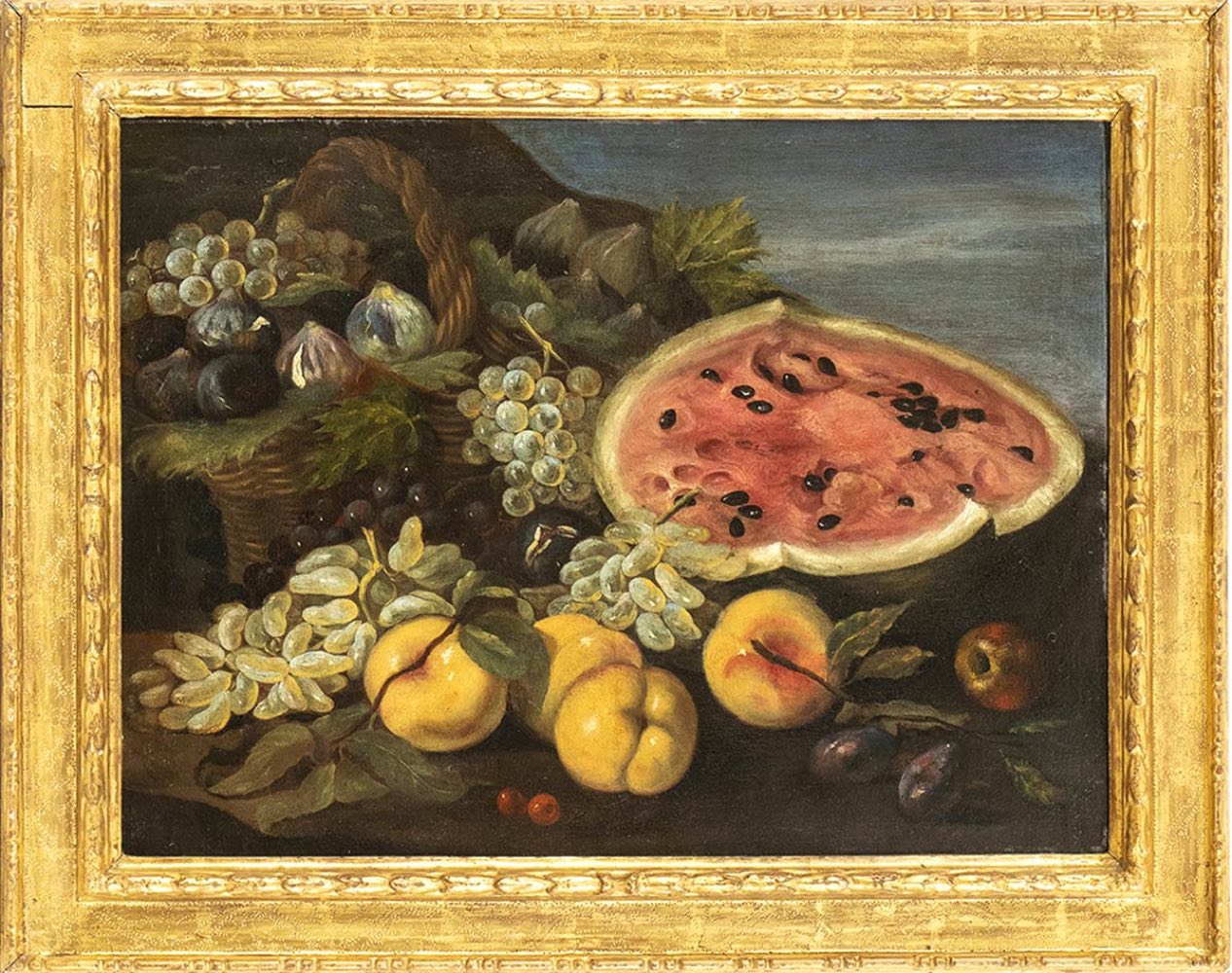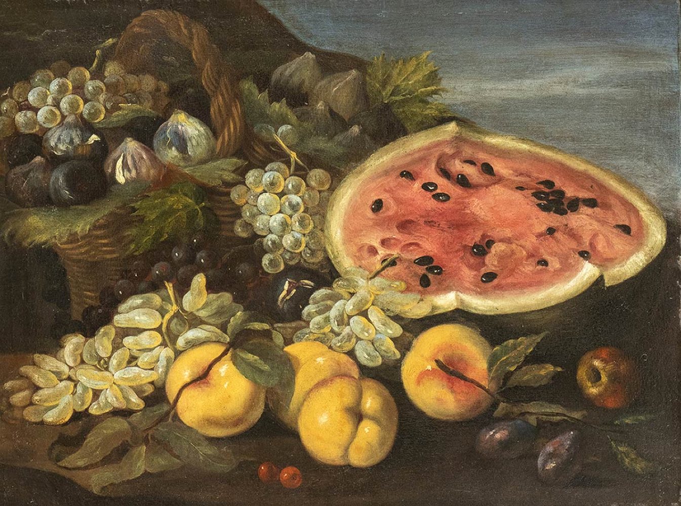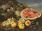 Natura morta di uva, fichi, pesche e un cocomero