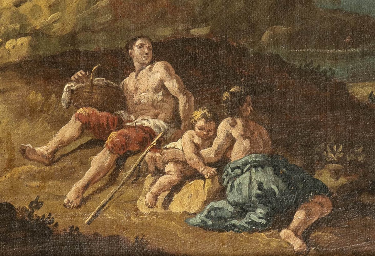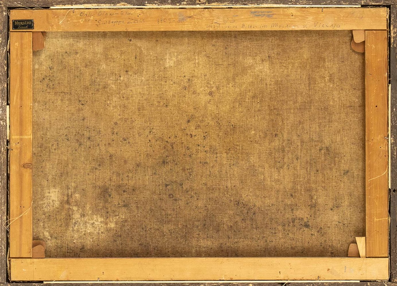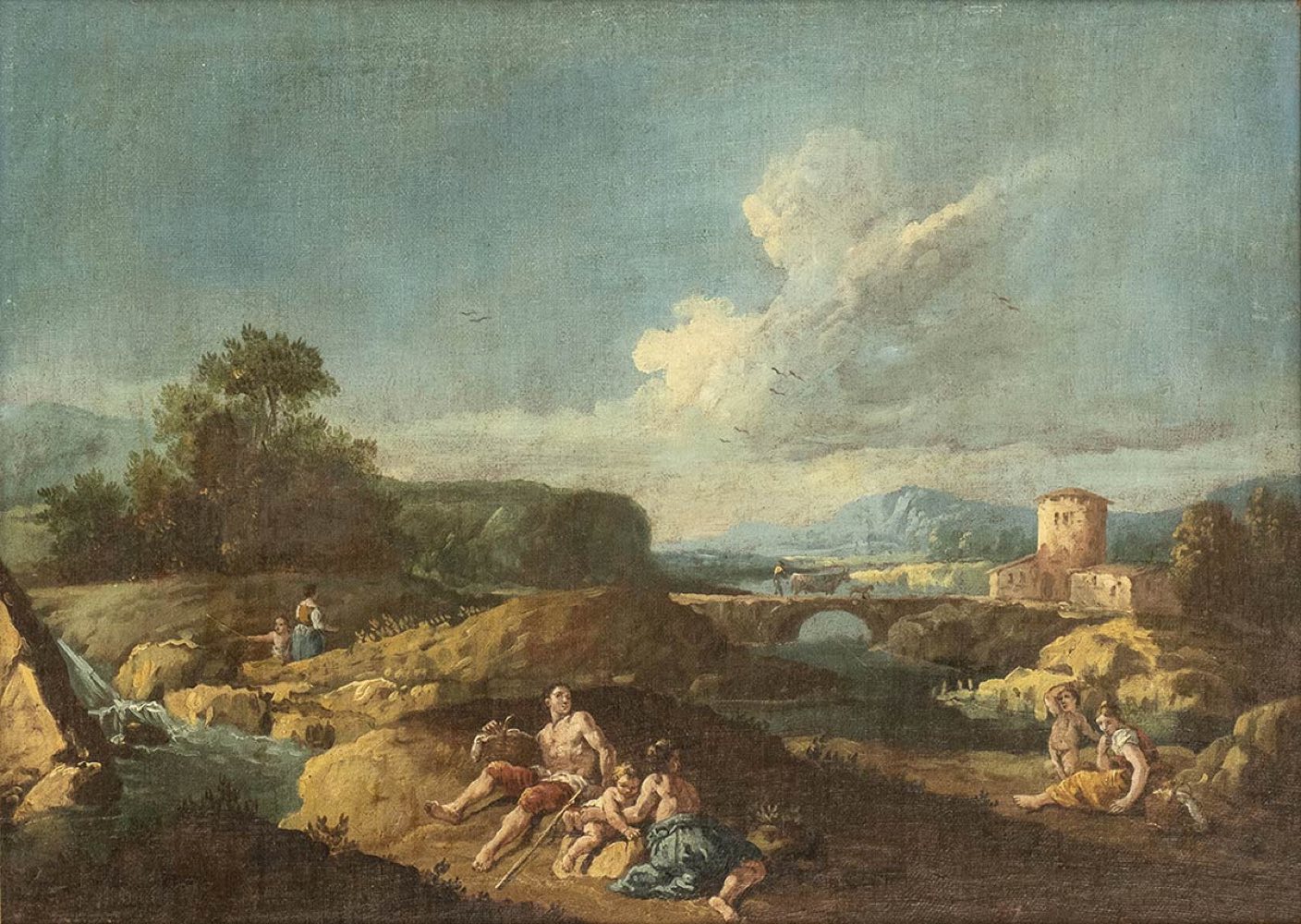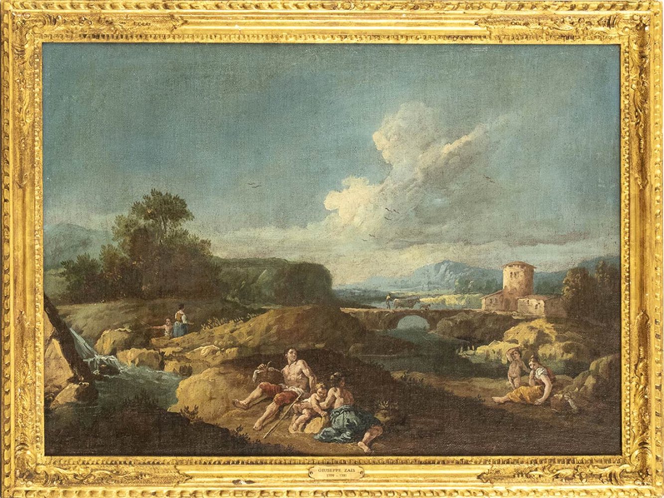 Questa notevole tela costituisce una significativa aggiunta al corpus di Giuseppe Zais, come già ebbe a rilevare il Prof. Ugo Ruggeri. Tra i maggiori esponenti della pittura rococò, Zais si specializzò in capricci, vedute, battaglie, ma soprattutto paesaggi. Rispetto a Zuccarelli l’interpretazione del paesaggio risulta in Zais più aderente al vero e meno conforme al gusto arcadico. In questo bello scorcio paesaggistico, liberamente ispirato alla natura dell'entroterra veneto, un cielo limpido si congiunge sulla linea dell'orizzonte con le azzurre catene montuose sullo sfondo, ad accentuare la prospettiva in profondità. In secondo piano spiccano un ponte e una torre circolare, mentre una famiglia di pastori occupa in primo piano il centro della scena.