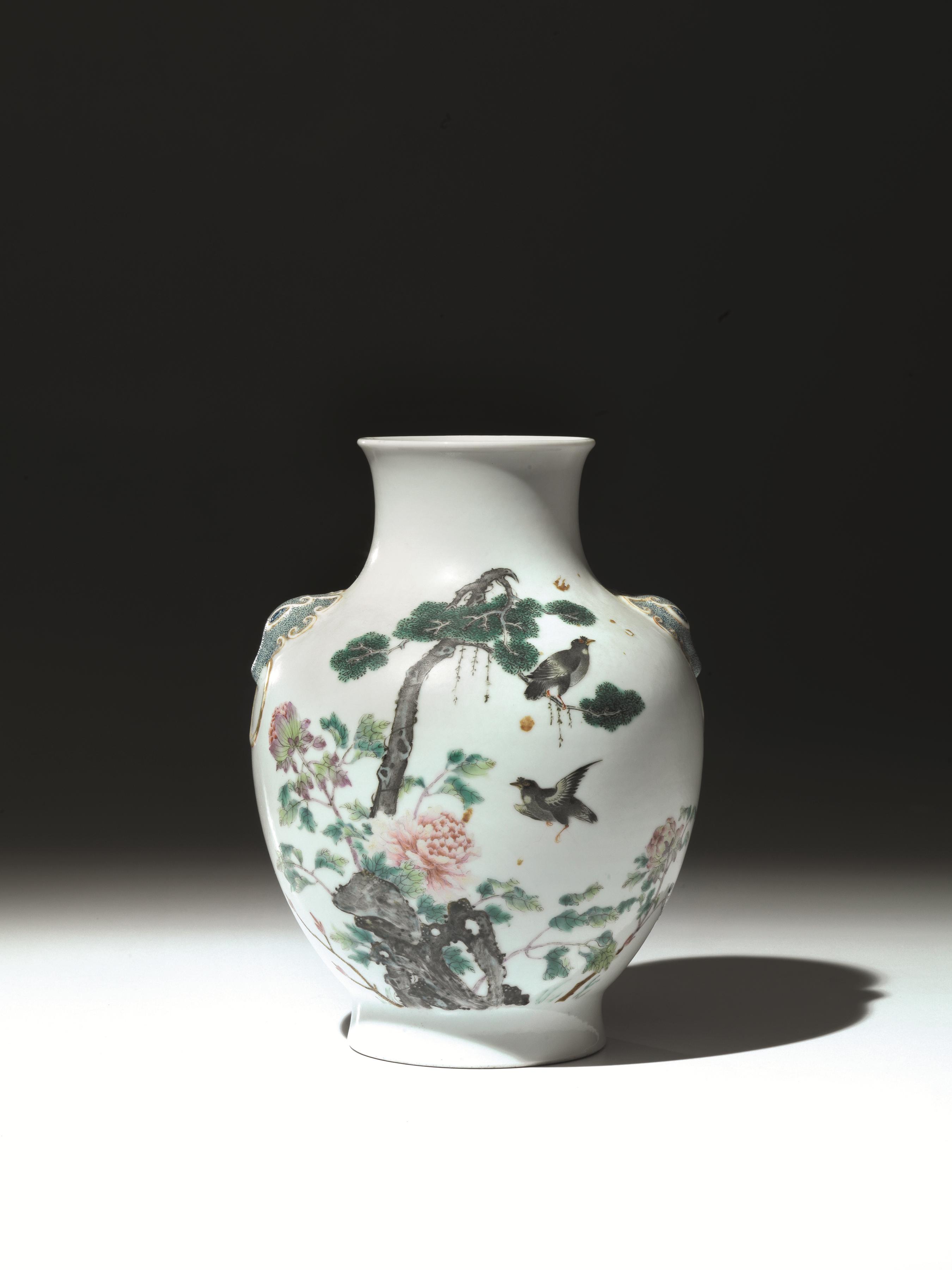Vaso, Cina, sec XIX, in porcellana dalla forma bombata, decorato con volatili su un albero e motivi floreali, sulle anse applicazioni a rilevo modellate a testa di cane di Pho con in bocca un anello, reca marchio periodo Qianlong (1736-1795), alt. cm 20