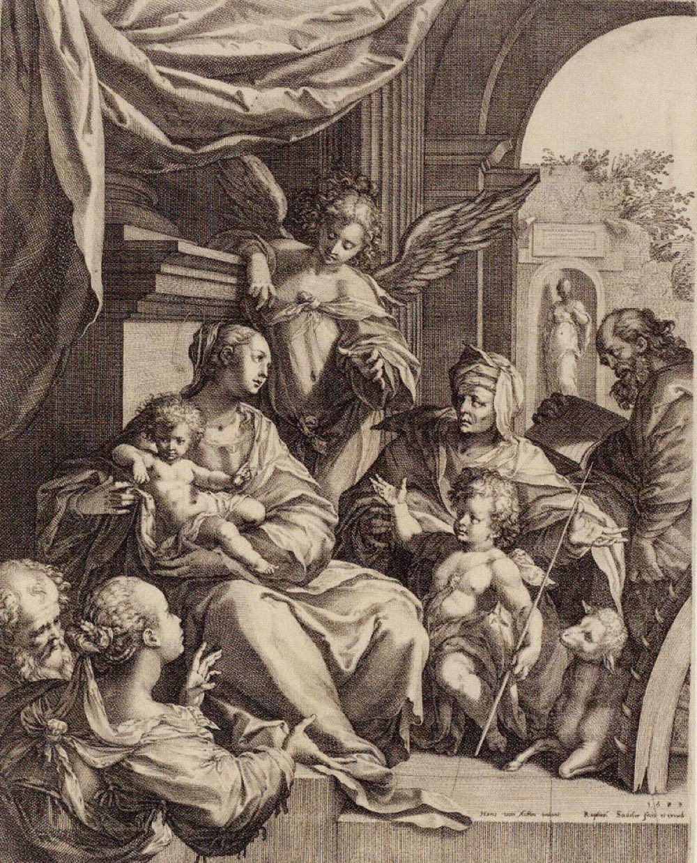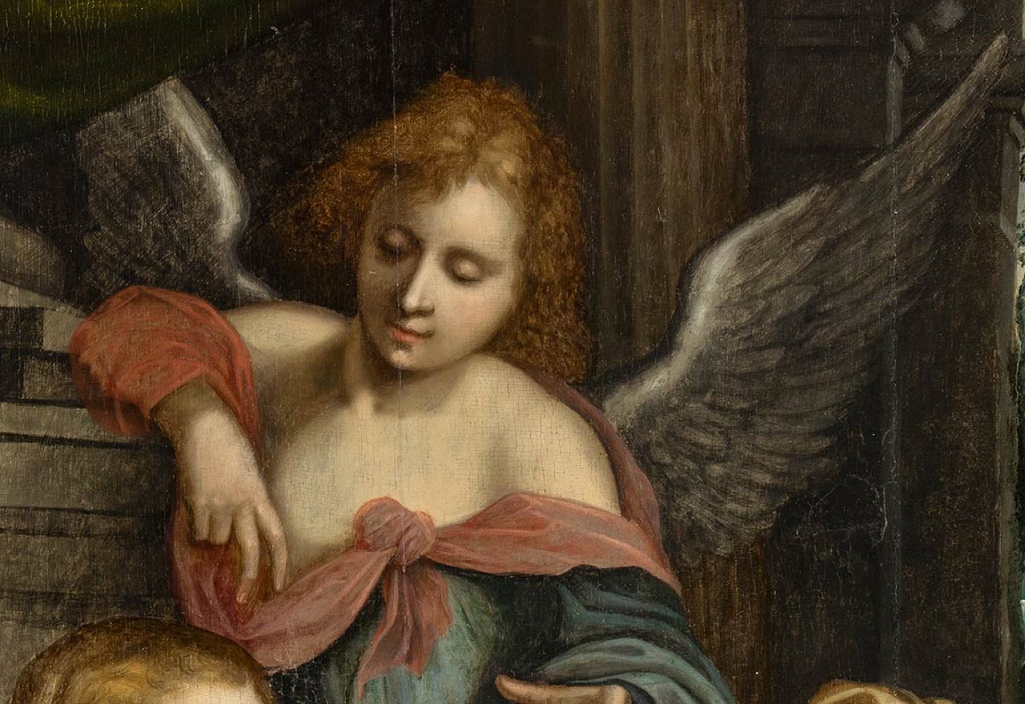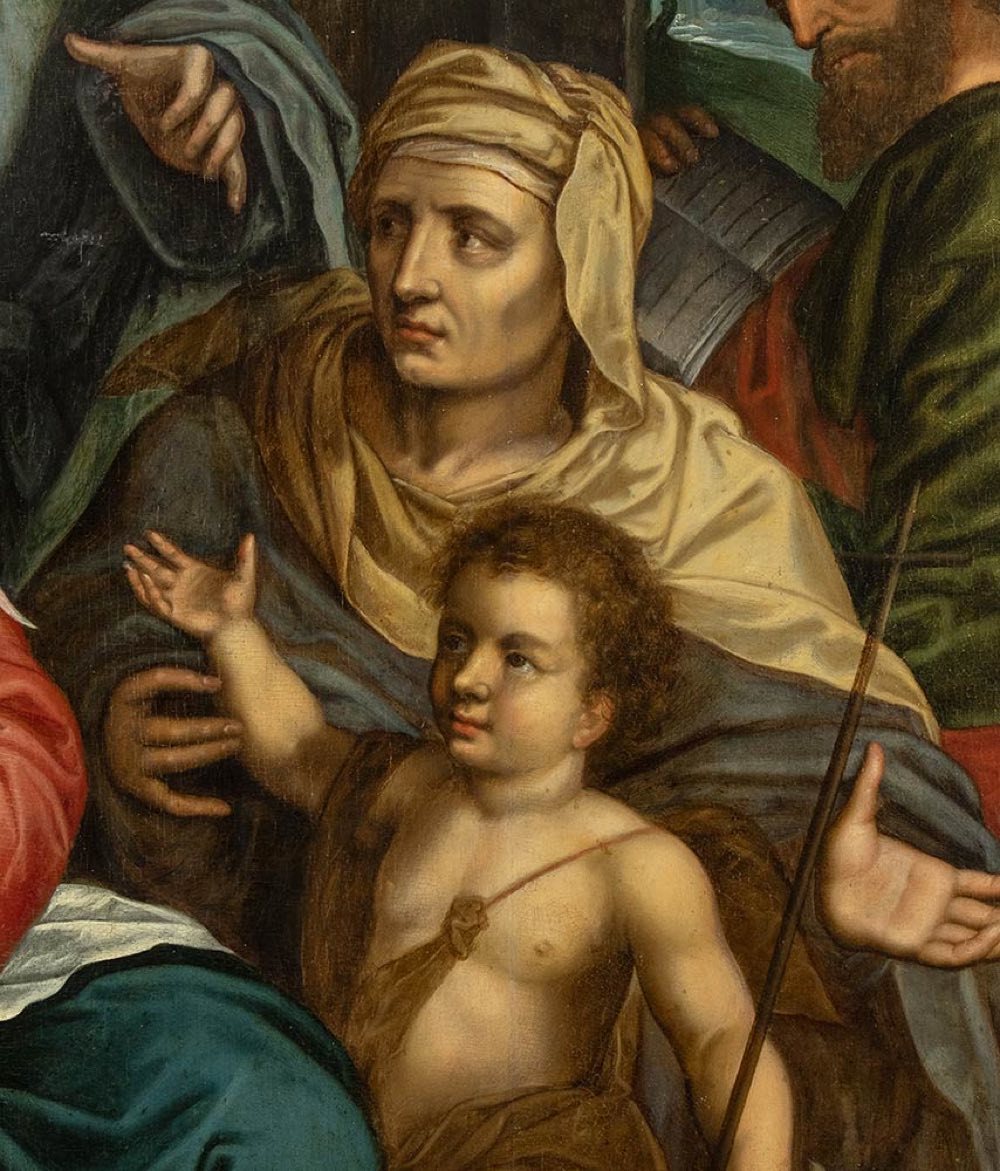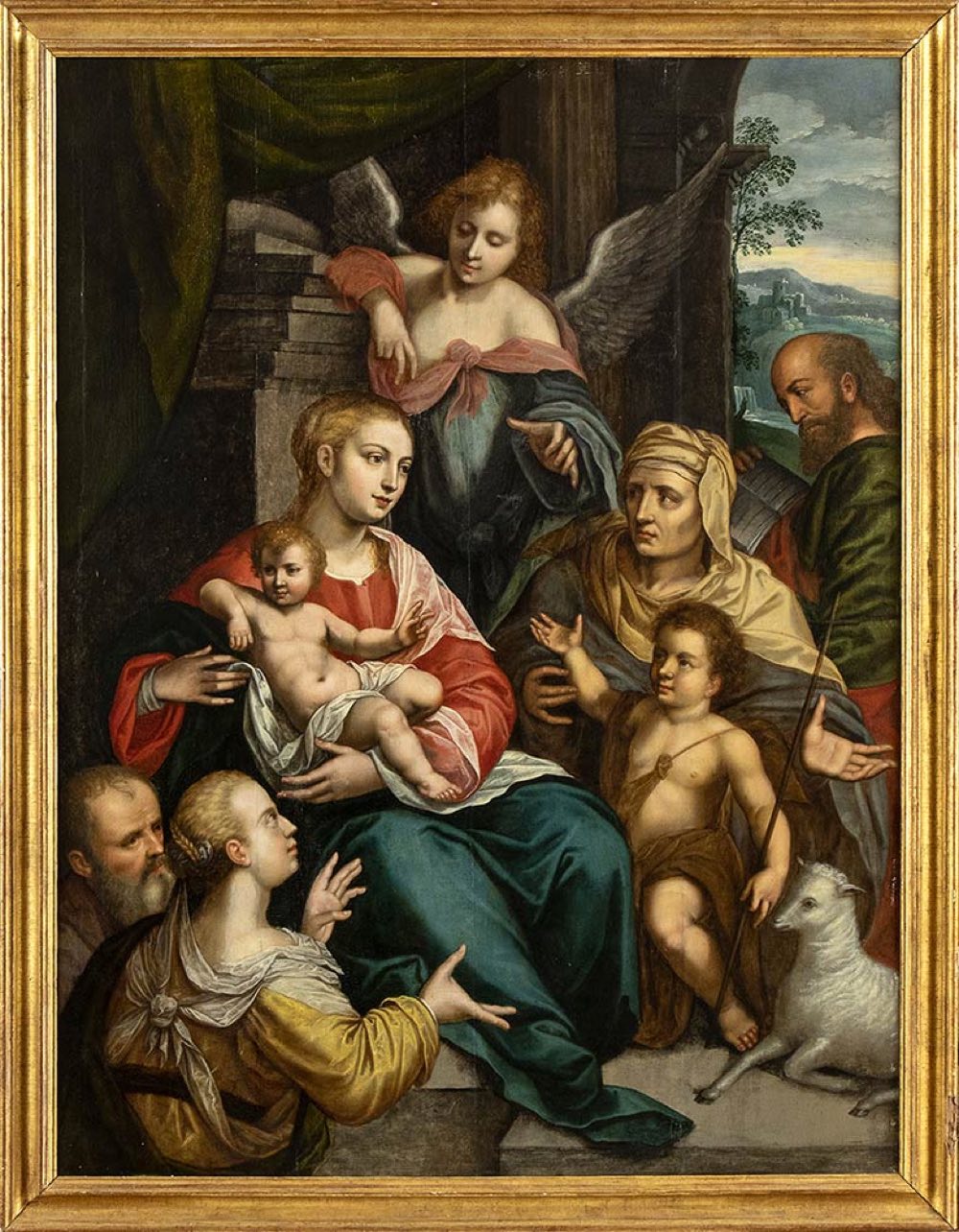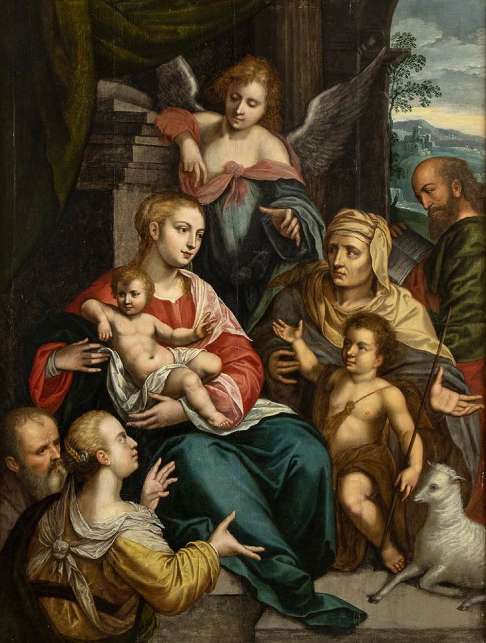 Questa bella tavola, destinata con ogni probabilità a un altare di una cappella privata, costituisce un caso attributivo di particolare interesse. Essa, infatti, presenta una strettissima relazione iconografica e compositiva con un'incisione di Raphel Sadeler datata 1589, derivata da un'invenzione di Hans von Aachen, come precisato nell'iscrizione in basso a destra ("HANS VON ACHEN INVENT"). Di questa incisione è nota anche una redazione pittorica, fedele alla lettera e di piccolo formato (cm. 47x36,2), oggi conservata nelle Bayerische Staatsgemäldesammlung (inv. 6349). Diversamente da quest'ultima la nostra tavola, pur se del tutto simile nell'iconografia e nella composizione, mostra significative differenze dalla stampa di Sadeler. Meritano soprattutto di essere qui segnalate il brano di paesaggio sulla destra e le fisionomie dei personaggi. La tavola mostra chiaramente la stretta influenza dei dipinti sacri più maturi di Raffaello, quali ad esempio la cosidetta Madonna del Divino Amore del 1516, oggi al Museo di Capodimonte, o la Madonna col Bambino San Giovannino e Santa Elisabetta del Prado. Rispetto a tali modelli il dipinto qui in oggetto presenta un impianto assai più marcatamente orientato in senso manierista che combina la più classica struttura piramidale, che ha il suo vertice nell'Angelo, con la linea diagonale sulla quale sono disposti tutti i personaggi, che dall'angolo inferiore sinistro si estende fino alla figura di Zaccaria.