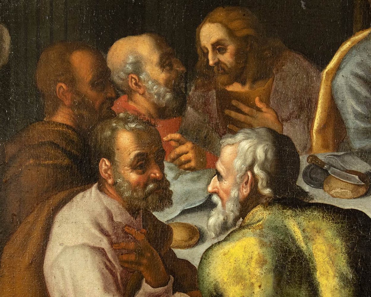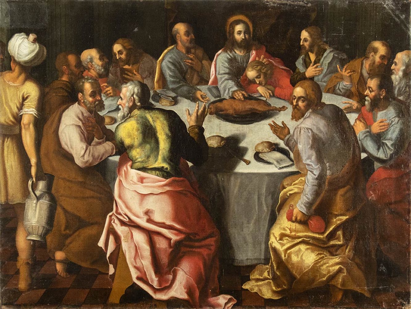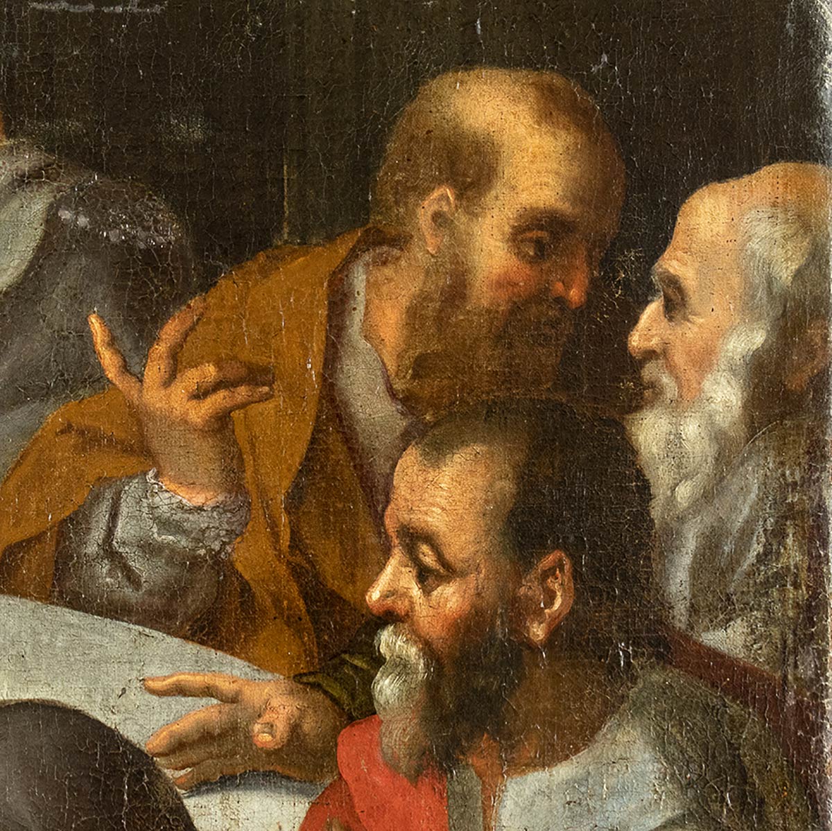 Questa tela inedita costituisce una rara e affascinante testimonianza deI tardo manierismo romano nella sua declinazione più estrosamente antinaturalista. Il preponderante modello di Michelangelo, di cui forse si può riconoscere il ritratto nell'apostolo collocato sulla sinistra a fianco del servo col turbante, è temperato da influssi nordici e tintoretteschi. I colori sono squillanti e contrastati, con abbinamenti cromatici arditi, come il verde e rosa dell'apostolo in primo piano di spalle. Il dipinto è strettamente connesso con l'afresco realizzato nel 1569 da Livio Agresti nell'Oratorio del Gonfalone a Roma. Da questo trasse ispirazione l'incisione di Cornelis Cort realizzata nel 1578, e ulteriormente rielaborata dallo stesso Cort, modificando lo sfondo, in una seconda stampa di qualche anno più tarda.
