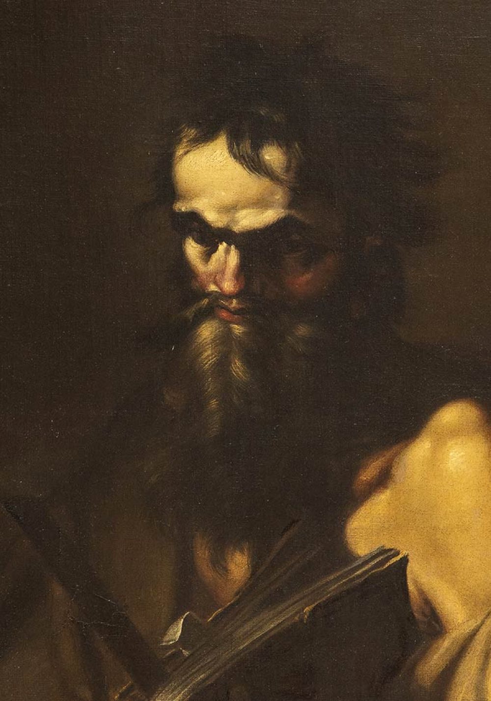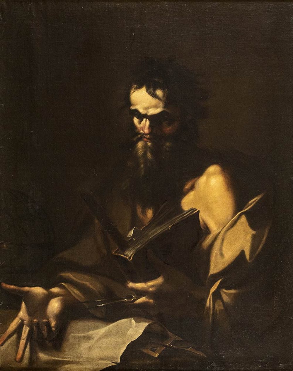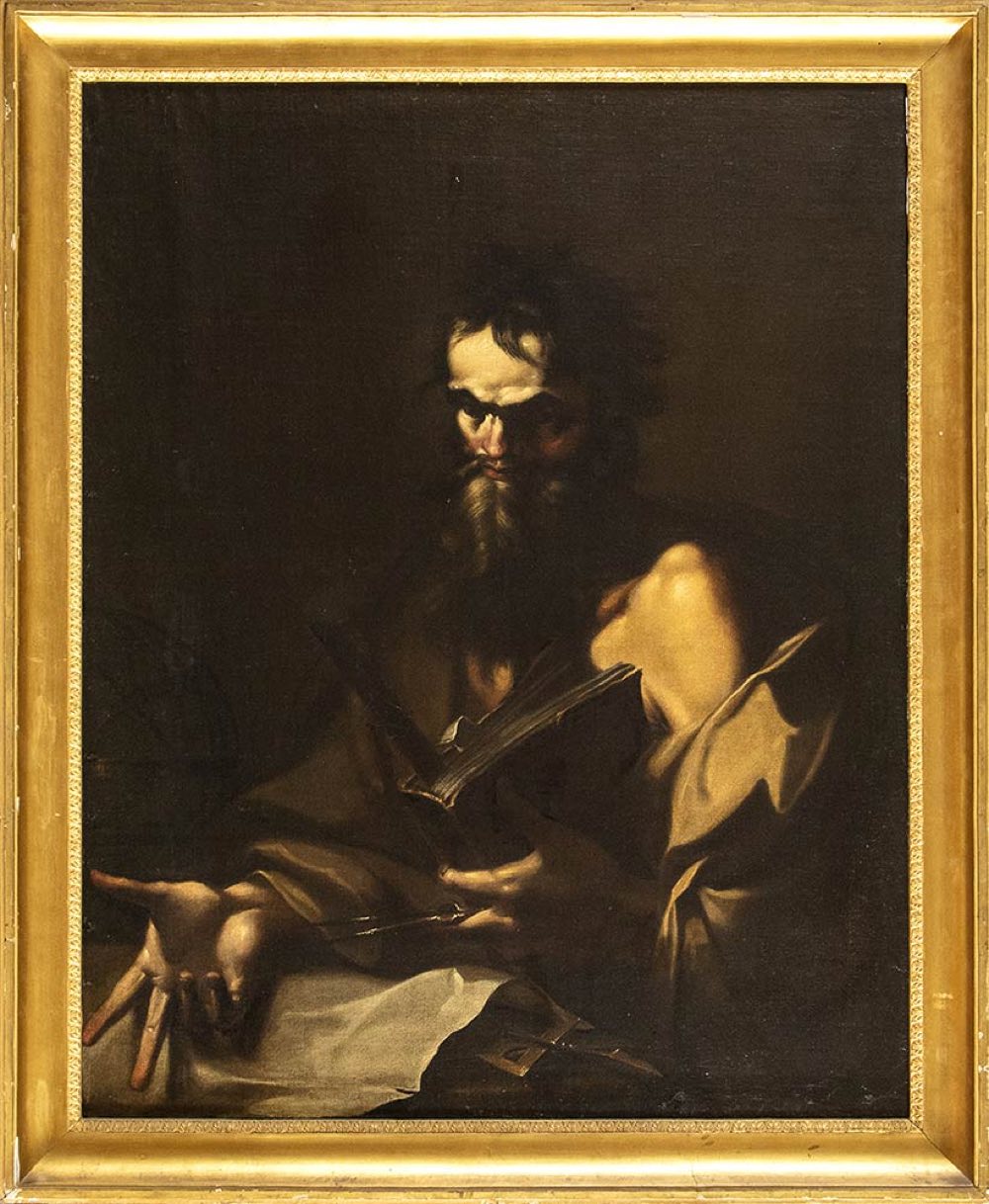 Questa impressionante effige di matematico si colloca all'intersezione di varie tipologie centrali nella produzione di Salvator Rosa: le immagini, per così dire astratte, di antichi filosofi, studiosi e uomini di scienza, nella tradizione di Ribera; la pittura concettosa, filosofica, in voga alla metà del Seicento grazie anche alla diffusione dello stoicismo; e forse l'autoritratto (se questa suggestione potesse trovare piena conferma per la nostra tela), da lui assiduamente praticato nelle più varie modalità: qui, eventualmente, anche nella fattispecie dell'autoritratto nelle vesti di figure di particolare valenza esemplare. Il migliore supporto, seppure non definitivo, all'intrigante ipotesi che Rosa abbia qui voluto rappresentarsi (e trasfigurarsi) è l'Autoritratto oggi al Musée des Beaux-Arts di Strasburgo, dove lo dovremmo ritrovare sui quarant'anni, qualcuno meno di quanti ne suggerisce il nostro dipinto. In quest'opera sofisticata, immagine ideale e insieme vivido e concreto ritratto "in azione", trovano espressione in una miscela singolare il distaccato disinteresse delle cose mondane, l'assoluta concentrazione sull'oggetto delle proprie meditazioni, ma anche l'energia vitale del pensiero nel suo svilupparsi. In ciò, seppure in una veste ormai pienamente matura, si potrebbe ritrovare il Rosa inquieto degli autoritratti giovanili.