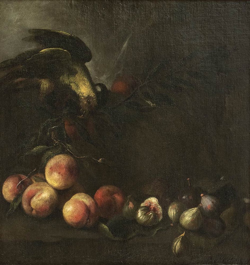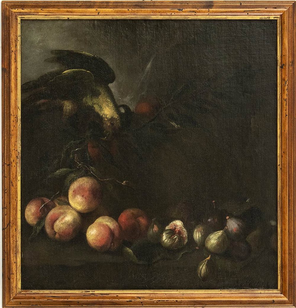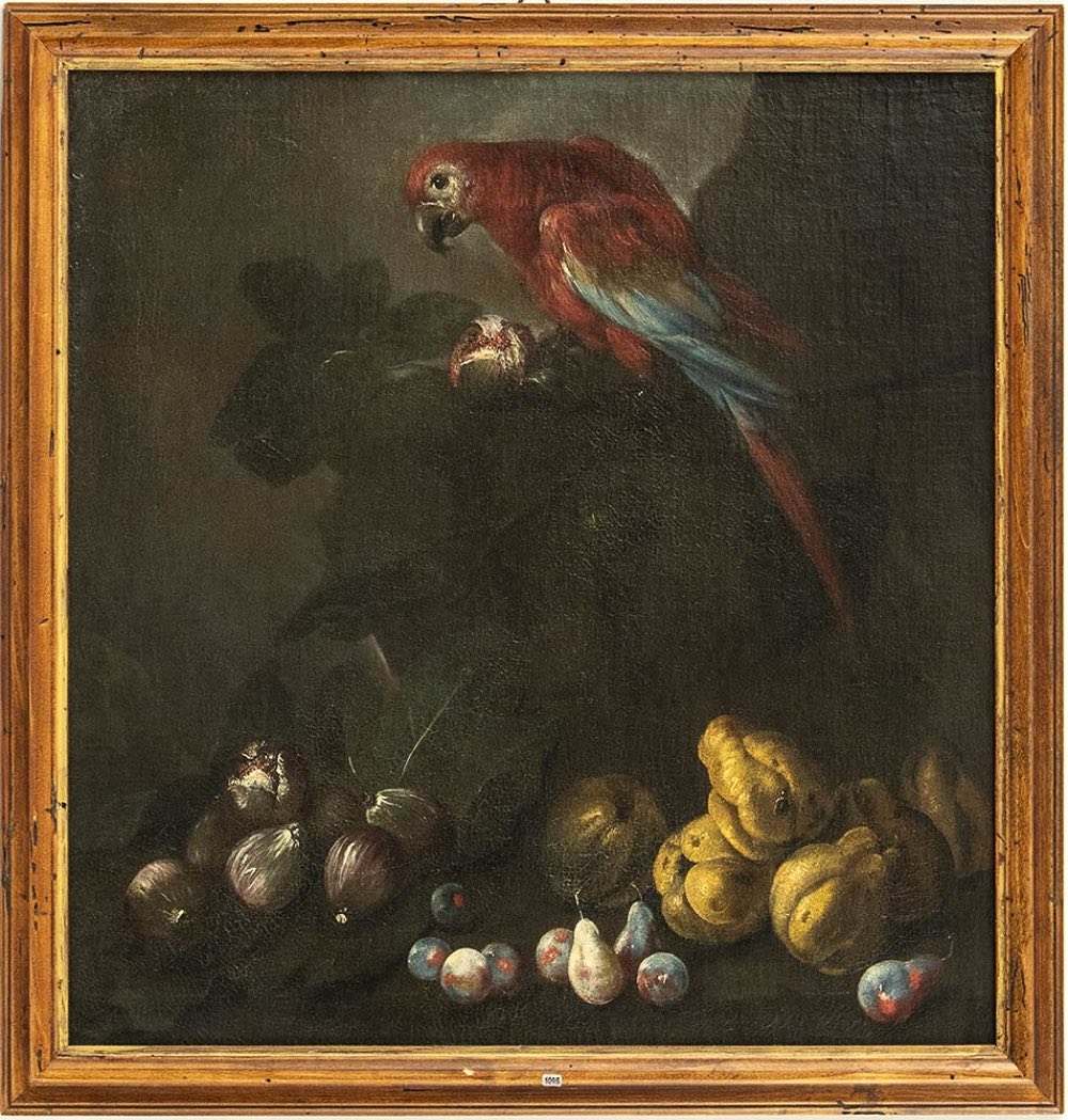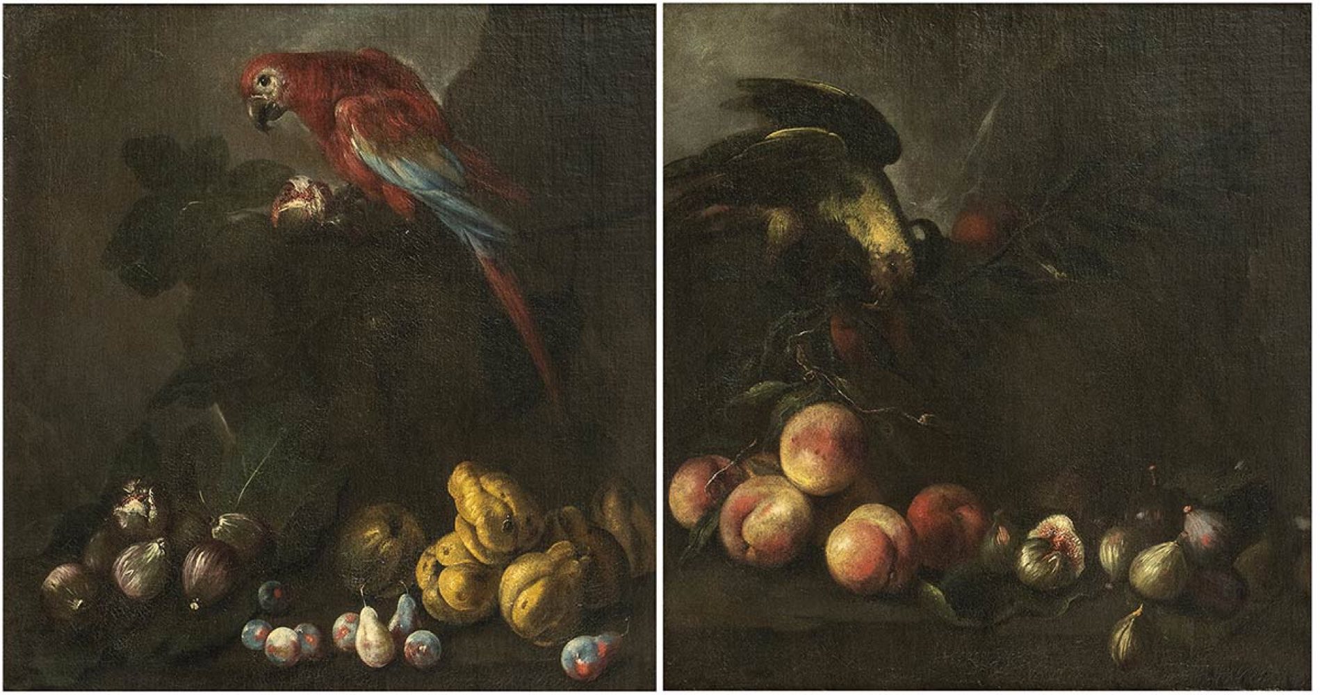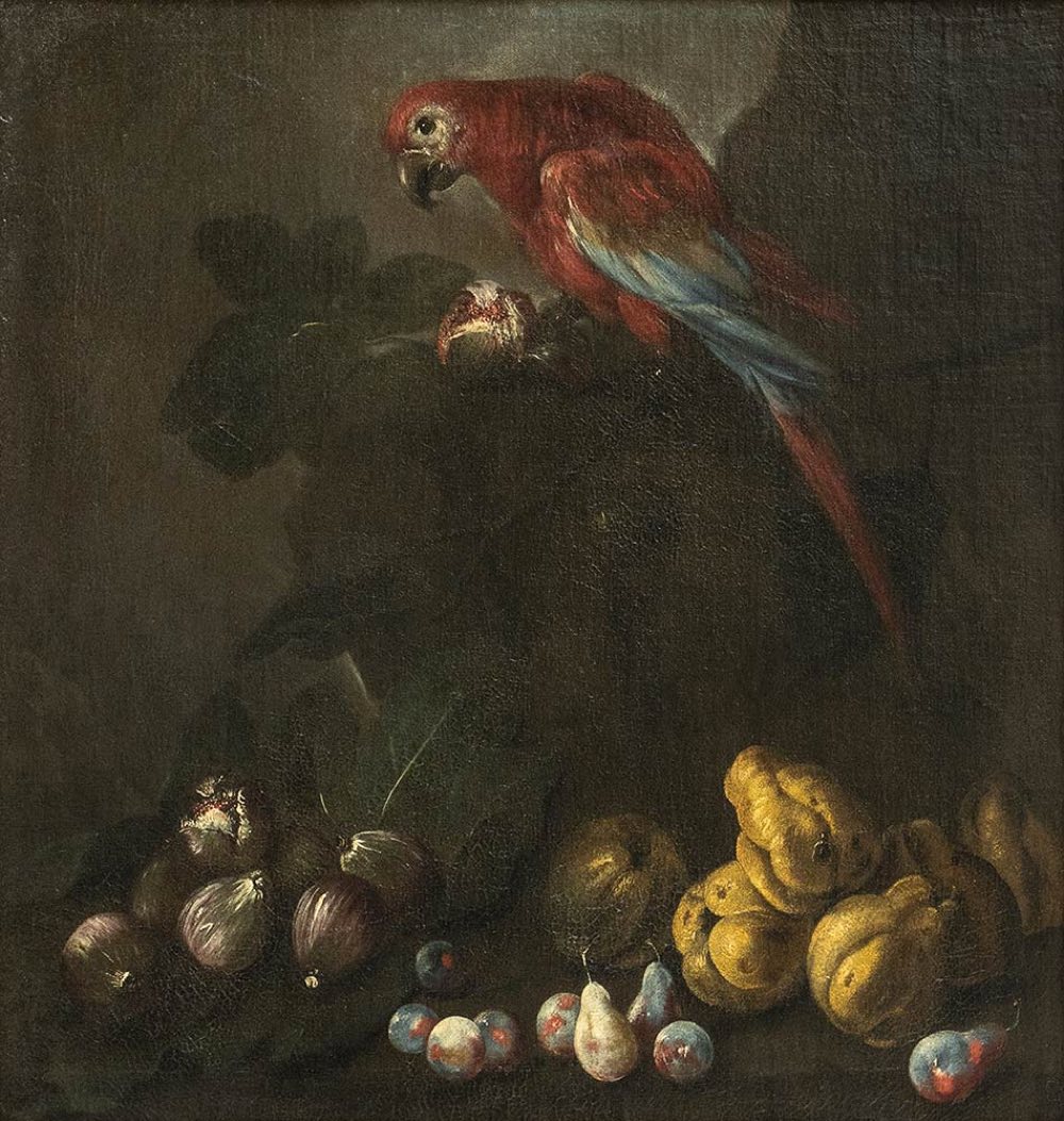 Questa notevole coppia di nature morte di frutta, entrambe ingentilite dalla presenza di un pappagallo, è stata ricondotta, con buoni argomenti, sebbene forse non definitivi, alla mano di Angelo Maria Rossi da Nicosetta Roio. A questo eminente specialista di nature morte attivo in Lombardia nella seconda metà del Seicento, è stato infine possibile assegnare con una certa sicurezza un nucleo omogeneo di dipinti in precedenza riferito dapprima allo pseudo Fardella e poi al Pittore di Carlo Torre.