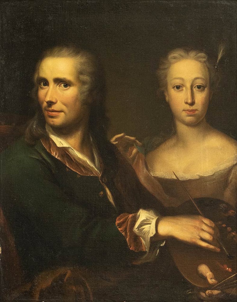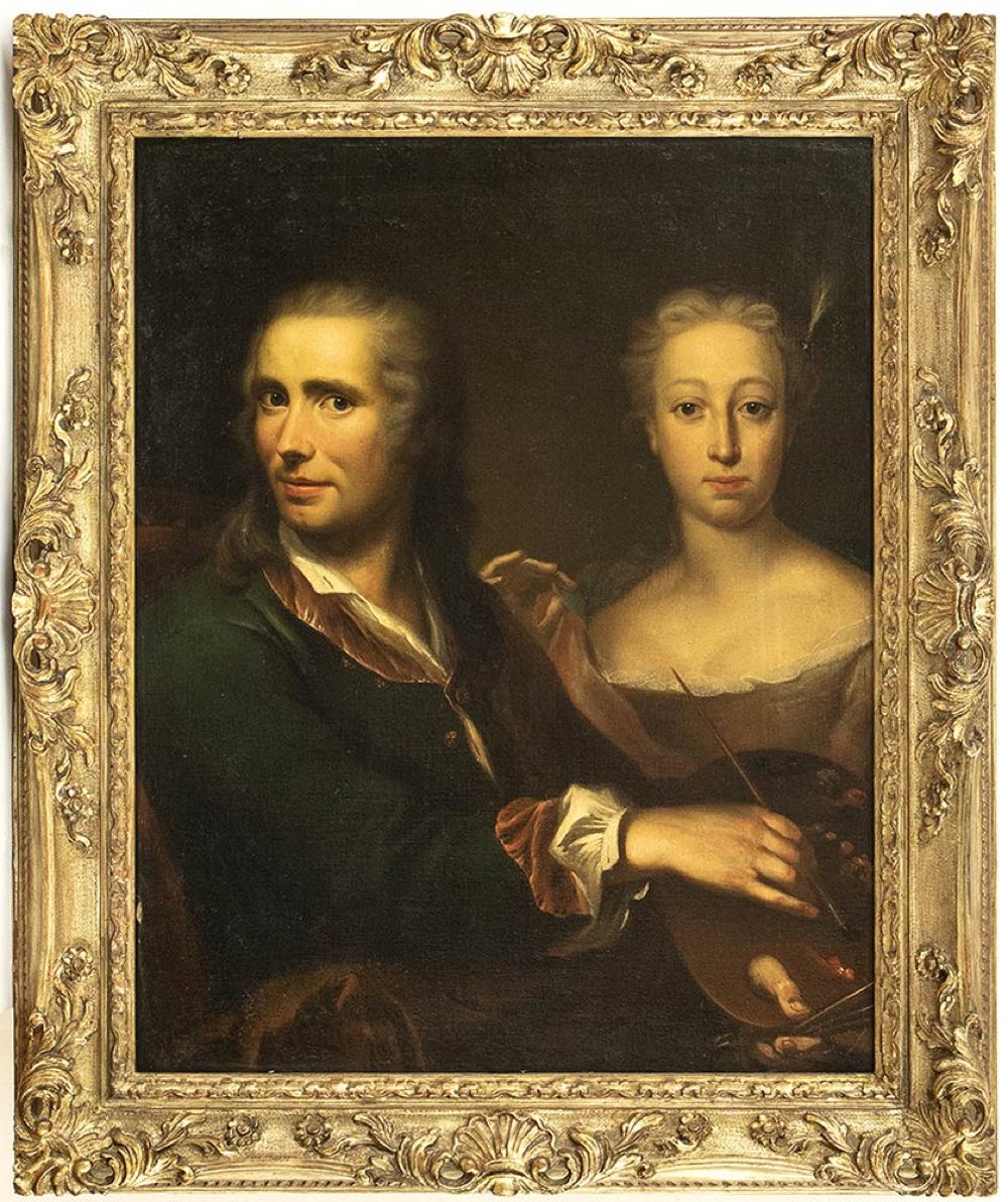 Questa bella tela, raffigurante un pittore intento a terminare un ritratto femminile, ed è stato riferito da Eduard Safarik alla mano di Johannes Nicohlaus Treu. Figlio di una famiglia di pittori di Bamberg, si specializzò nella ritrattistica e sotto Adam Friedrich von Seinsheim si trasferì a Würzburg, dove fu nominato pittore di corte. Questo tipo di autoritratto, con la raffigurazione del dipinto nel dipinto rientra in una tipologia molto comune nella cerchia del pittore ceco Ján Kupecký di cui Treu faceva attivamente parte. Molte delle sue opere oggi si trovano al Historisches Museum e nella Neue Residenz a Bamberg e nel Mainfränkisches Museum di Würzburg.