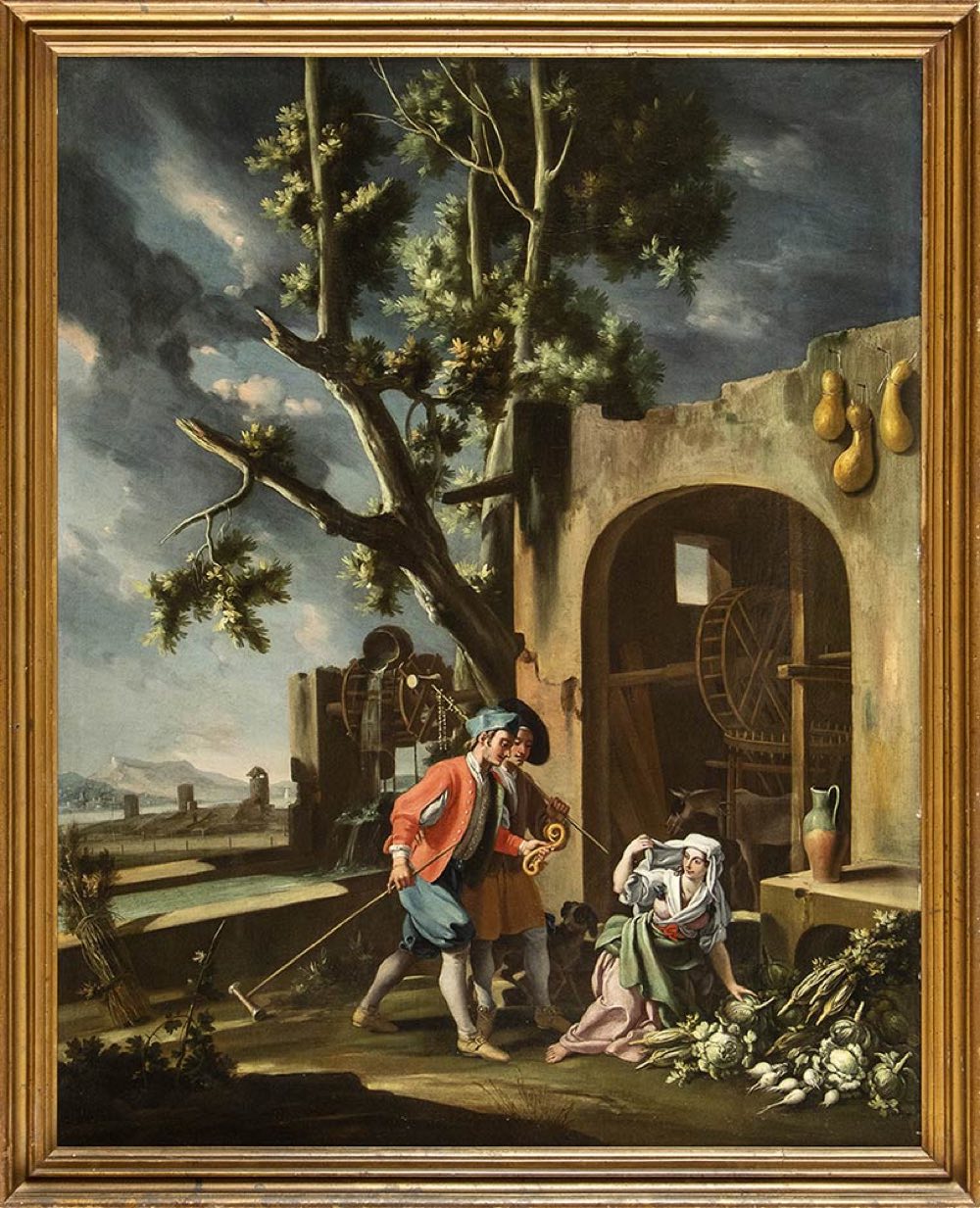 Filippo Falciatore fu tra i protagonisti della scena artistica partenopea tra il quarto e il settimo decennio del Settecento. Dotato di raffinati mezzi tecnici ed espressivi, fu impegnato su tutti i fronti della pittura di storia. La sua fama principale è però legata alle scene galanti e agli intrattenimenti in giardino della nobiltà napoletana, e forse ancor più alle scene di genere di carattere più rustico, legate alla vita quotidiana delle classi umili, descritte con un tono costantemente sapido e leggero. Di teale produzione costituisce una notevole testimonianza la nostra grande tela inedita imperniata sui motivi, particolarmente cari al Falciatore pittore di genere, dell'ortolana e del mulino. Spiccano qui anche il bel paesaggio punteggiato di mulini, con il golfo di Napoli sullo sfondo, l'albero minutamente descritto e il bel brano di cielo, denso di nuvole scure. Confronti inequivocabili legano la presente tela a molte altre opere certe del pittore: si vedano, ad esempio, le opere pubblicate da Nicola Spinosa in Pittura napoletana del Settecento. Dal Barocco al Rococò, Napoli 1993, nn. 255-258, pp. 151, 153 e 317-318.