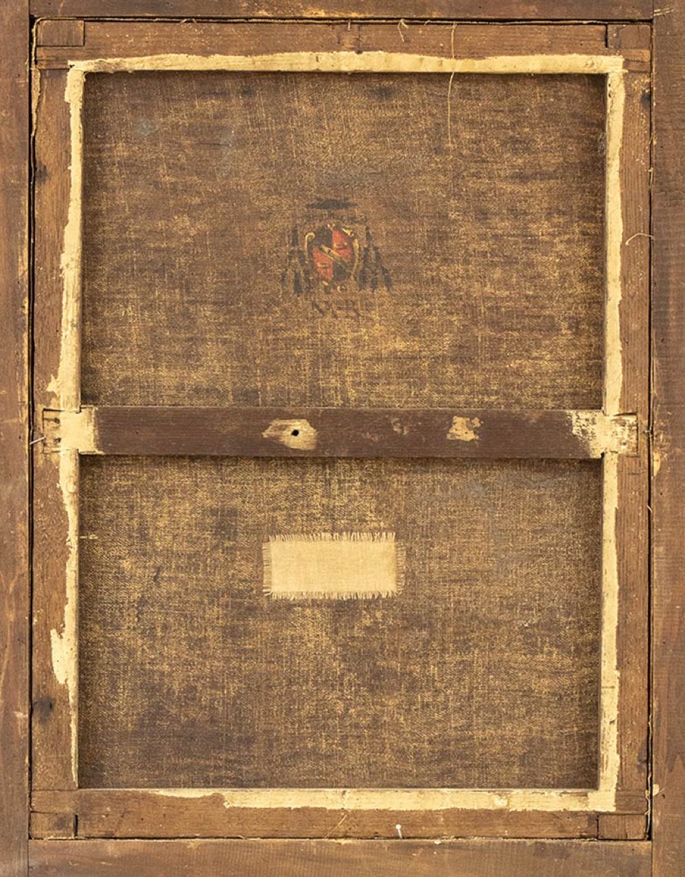 Dipinto in prima tela. La tela reca al retro timbro con stemma della famiglia Rondinini (o Rondanini) di Roma. L'originale provenienza, di così alto rango e gusto collezionistico, potrebbe aprire qualche spiraglio per sciogliere il rebus attributivo intorno a questo notevolissimo ritratto. Sembra possibile un'origine non-italiana per il suo autore, forse francese, ma ancor più evidente è il suo diretto aggiornamento sui modi della ritrattistica romana post-caravaggesca.