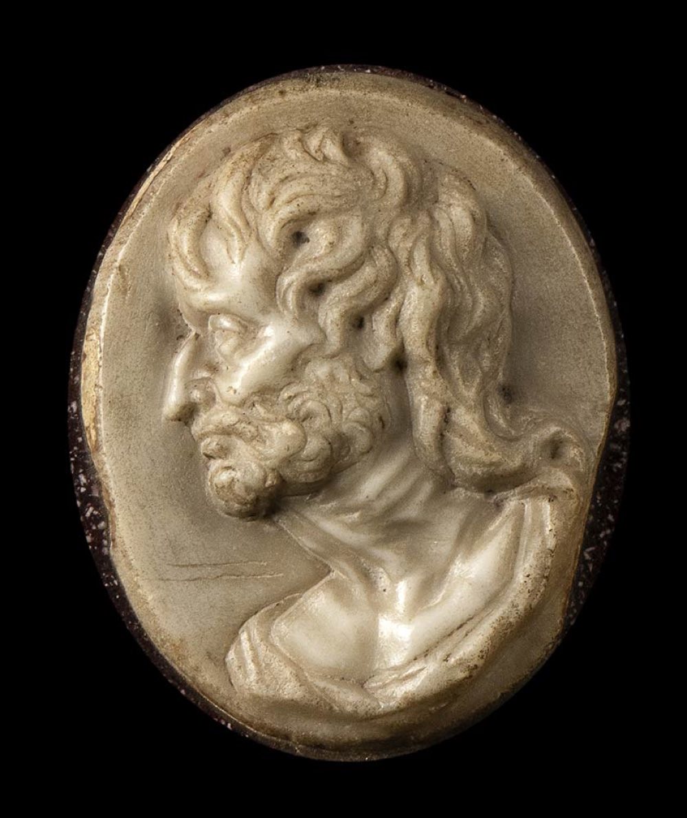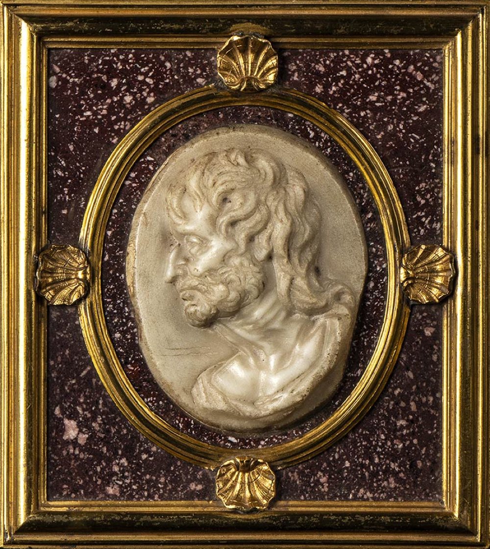 Testa di uomo barbuto di profilo, placca di marmo entro importante base di porfido e cornice in legno dorato con motivi di conchiglie