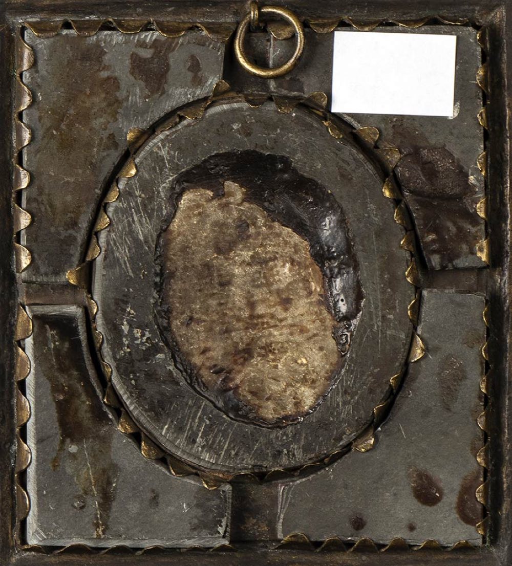 Porfido e marmo bianco, cm. 14x12. Con cornice cm. 17x15