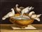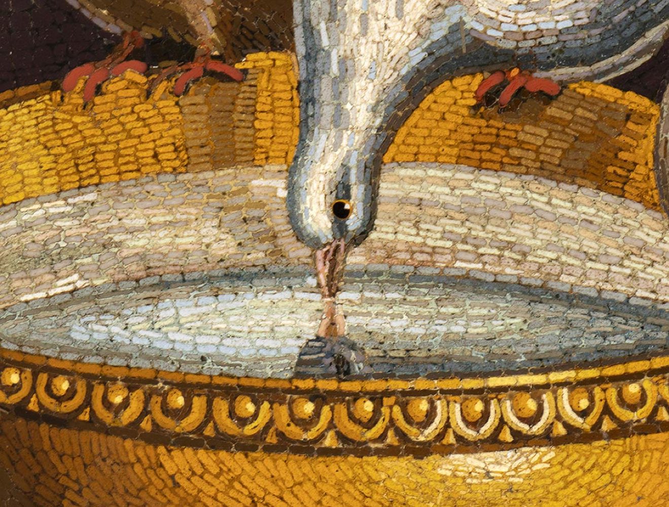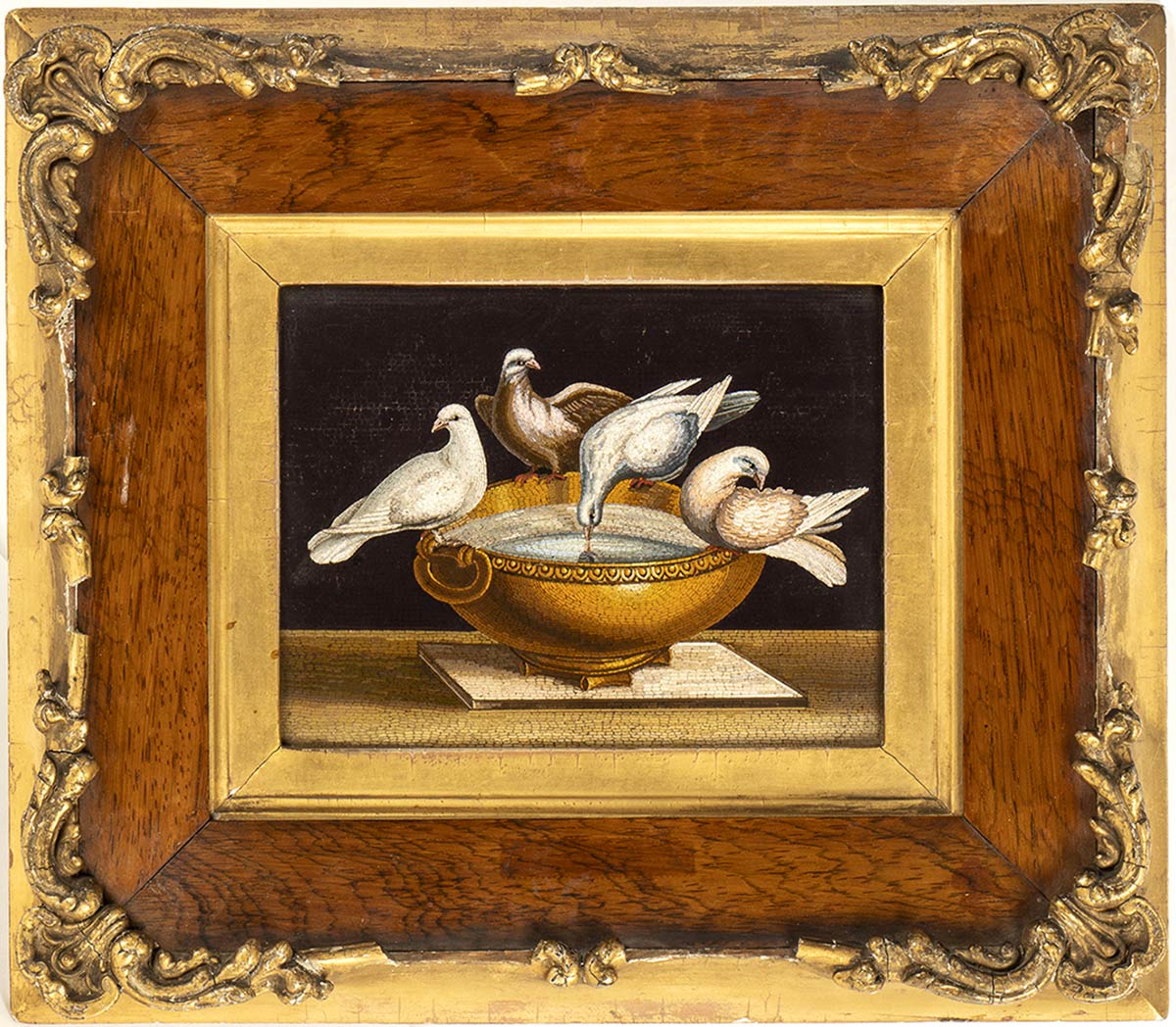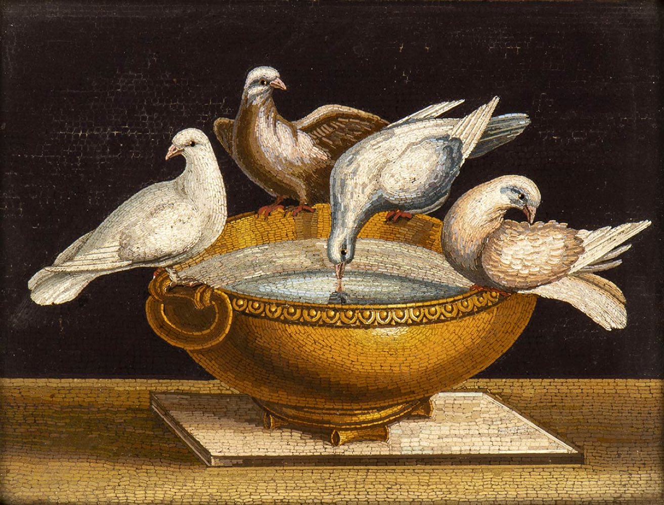 Questo micromosaico di finissima qualità deriva dal celebberrimo mosaico romano rinvenuto nella Villa Adriana a Tivoli e oggi conservato ai Musei Capitolini. Il soggetto fu reso celebre da Plinio il vecchio nella Naturalis Historiae (lib. XXXVI, 184) dove fu descritto come opera dell'artista greco Sosos eseguita nel II secolo a. C.