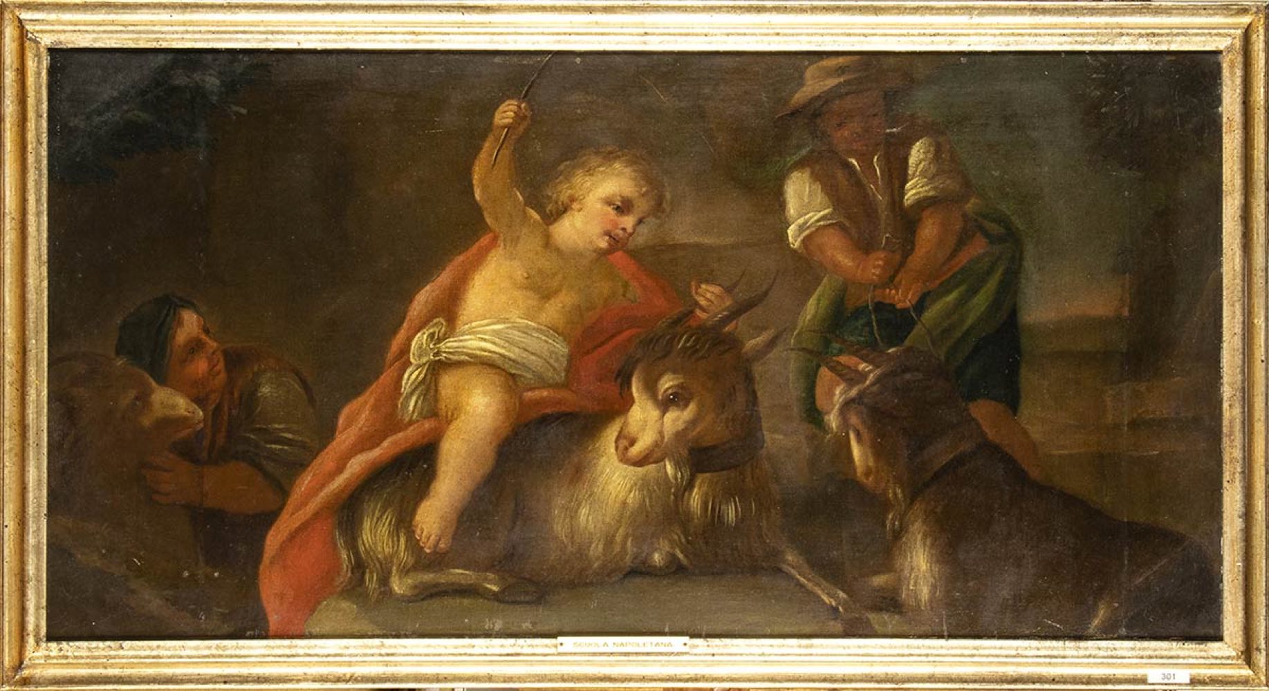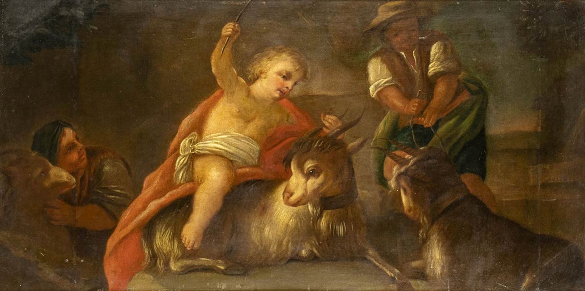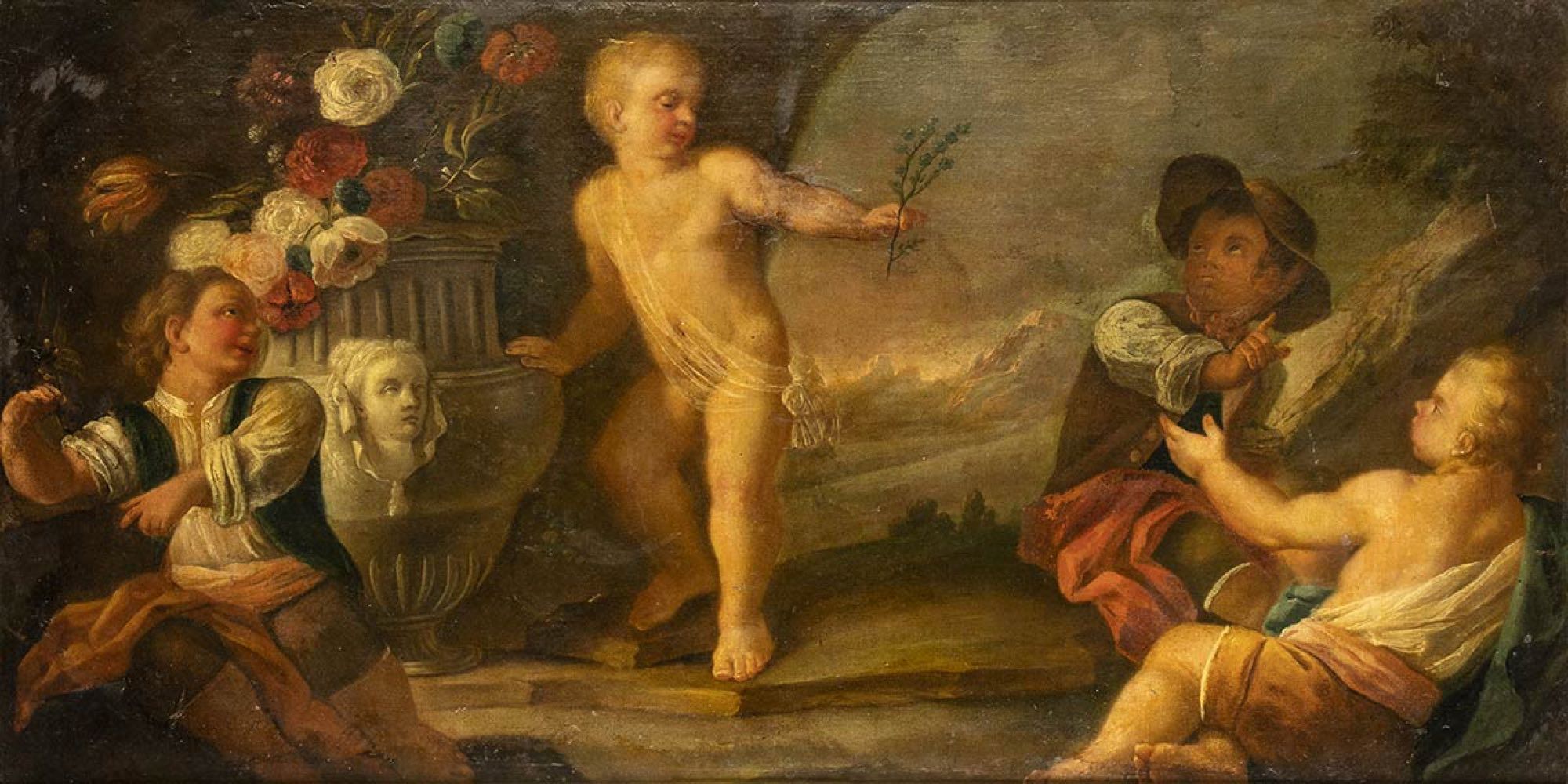 a) Bimbi che giocano, con grande vaso di fiori e paesaggio sullo sfondo - b) Bimbi che giocano con due capre. Coppia di dipinti sovrapporta.