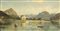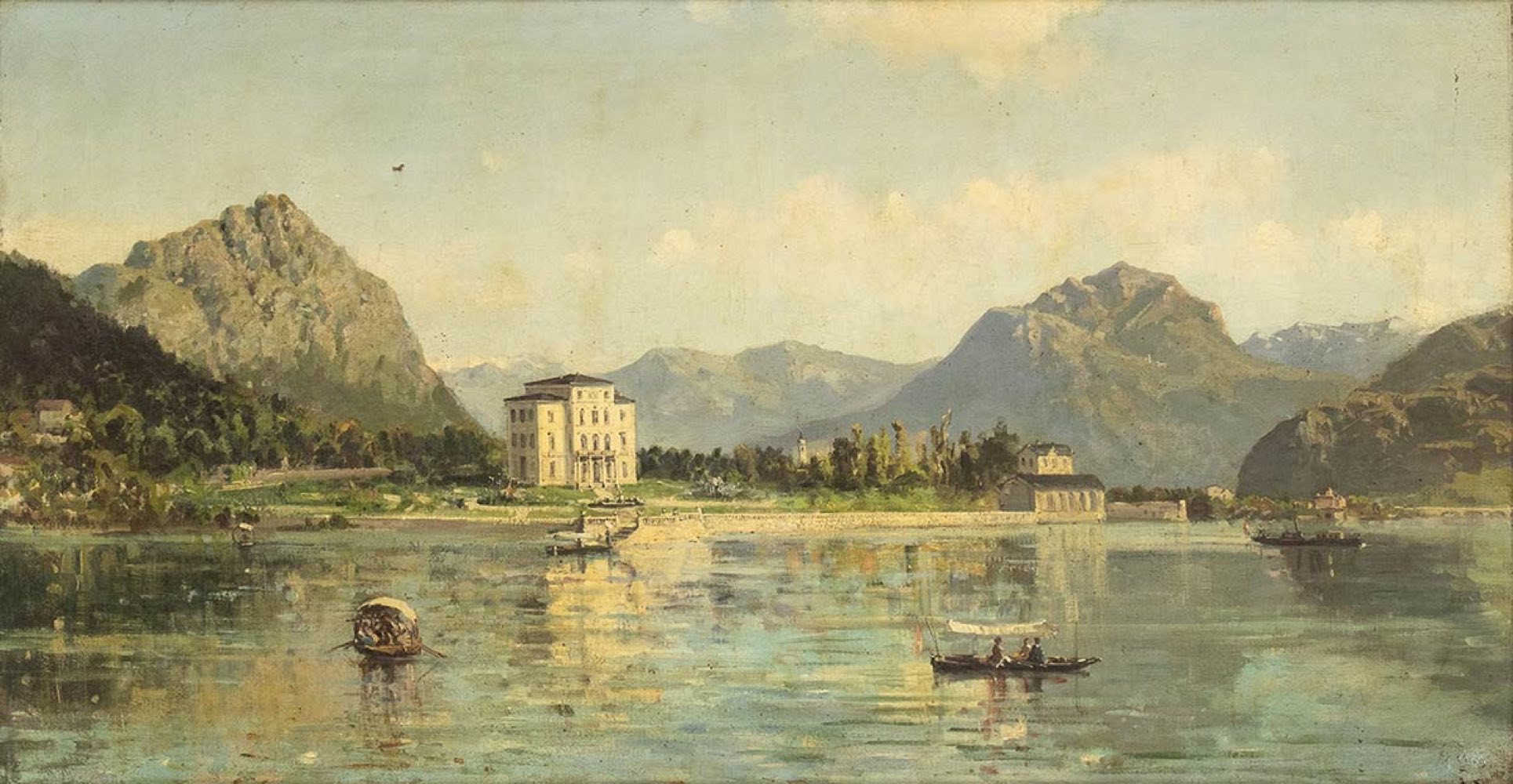 Veduta di lago alpino, con barche e una villa sullo sfondo