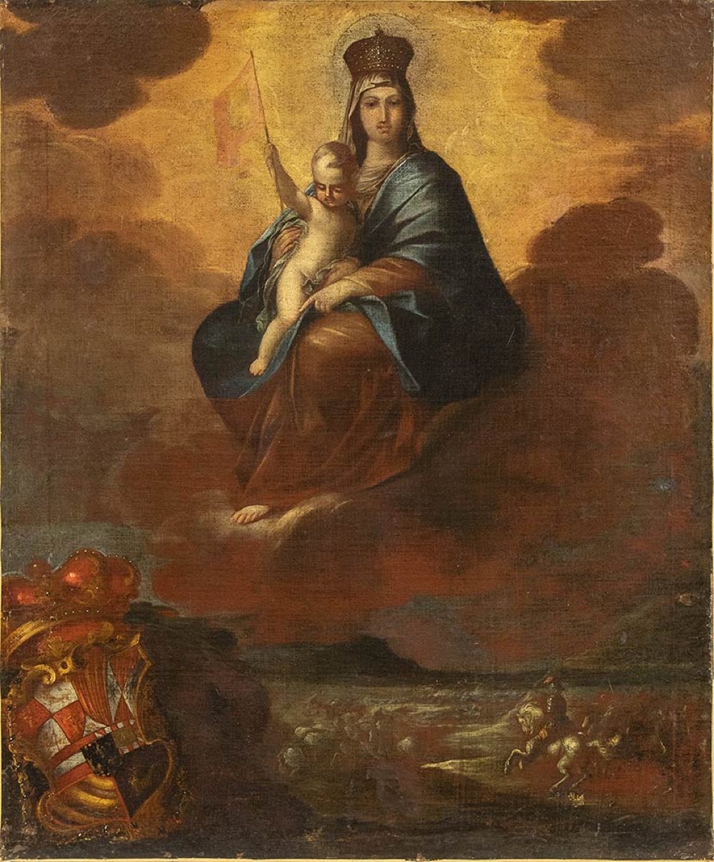 Madonna con Bambino in gloria con arme gentilizio e scena di battaglia sullo sfondo