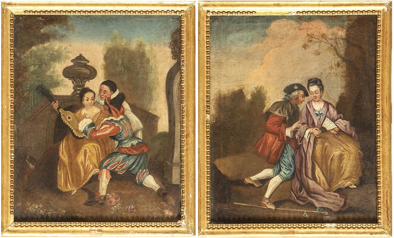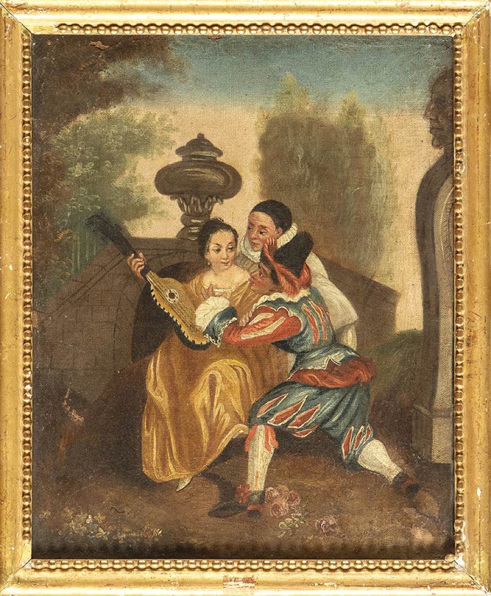 a) Giardino con attori della commedia dell'arte - b) scena di seduzione. Coppia di dipinti.
