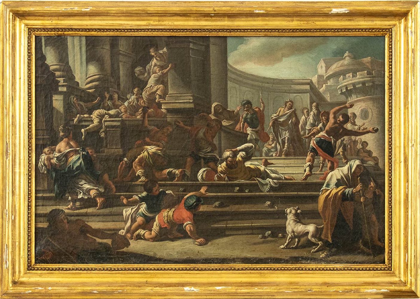 Questa tela di fine qualità costituisce probabilmente un bozzetto ad un avanzato stadio preparatorio, o addirittura il modello finale da presentare al committente, per una perduta tela destinata all’altare di una chiesa. Militano a favore di questa ipotesi l’articolata composizione, fitta di personaggi raffigurati nella più diverse posture, e l’impianto marcatamente monumentale, con le composite architetture che fanno da set alla scena. L’evento tragico del martirio del santo, pur centrale dal punto di vista iconografico, è qui privato delle sue connotazioni crudamente realistiche in favore di una rappresentazione di marcata teatralità, alleggerita della drammaticità propria dell’episodio agiografico. D’accordo con l’indicazione di Vincenzo Pacelli, il dipinto può essere collocato cronologicamente giusto alla metà del XVIII secolo.