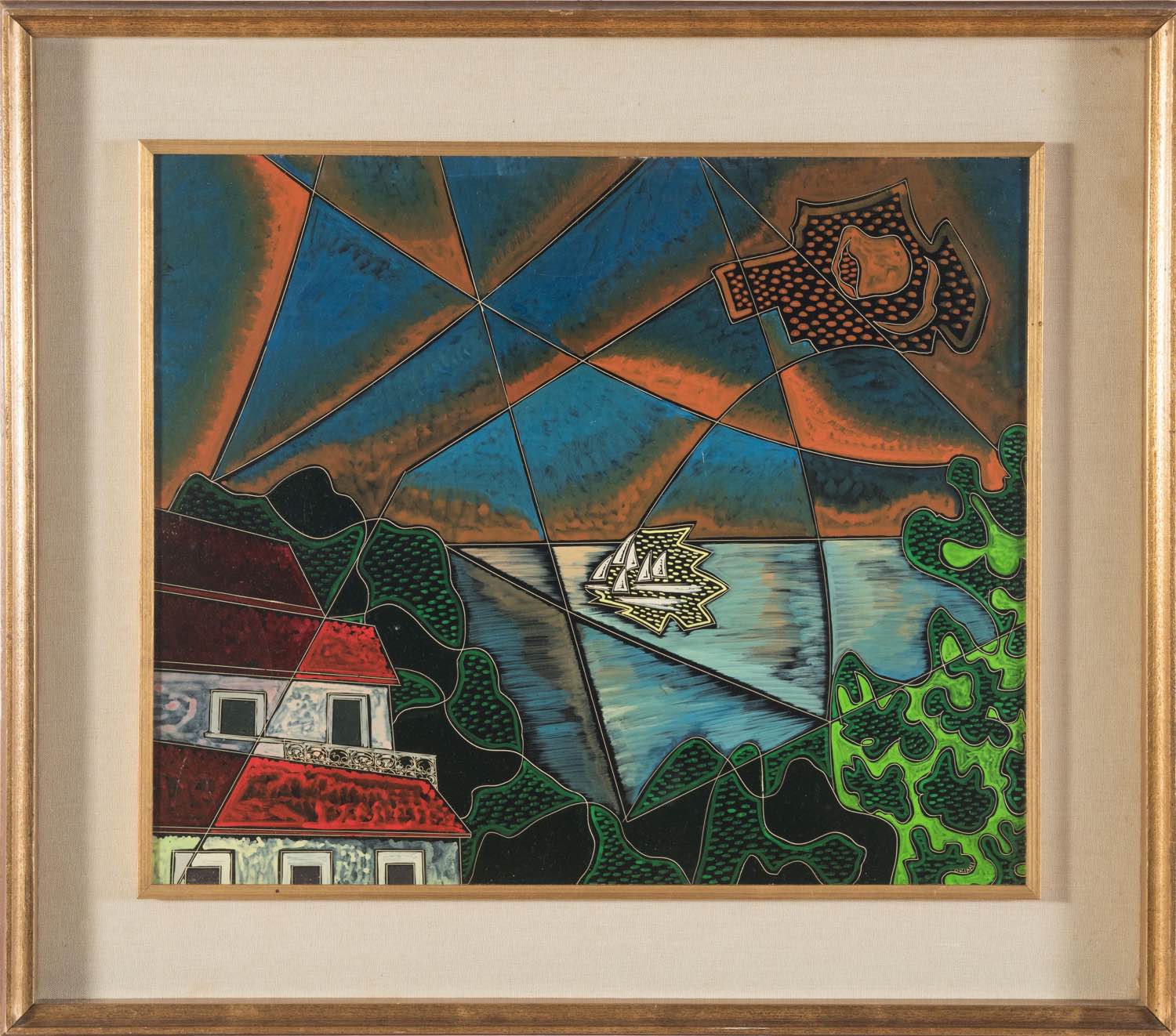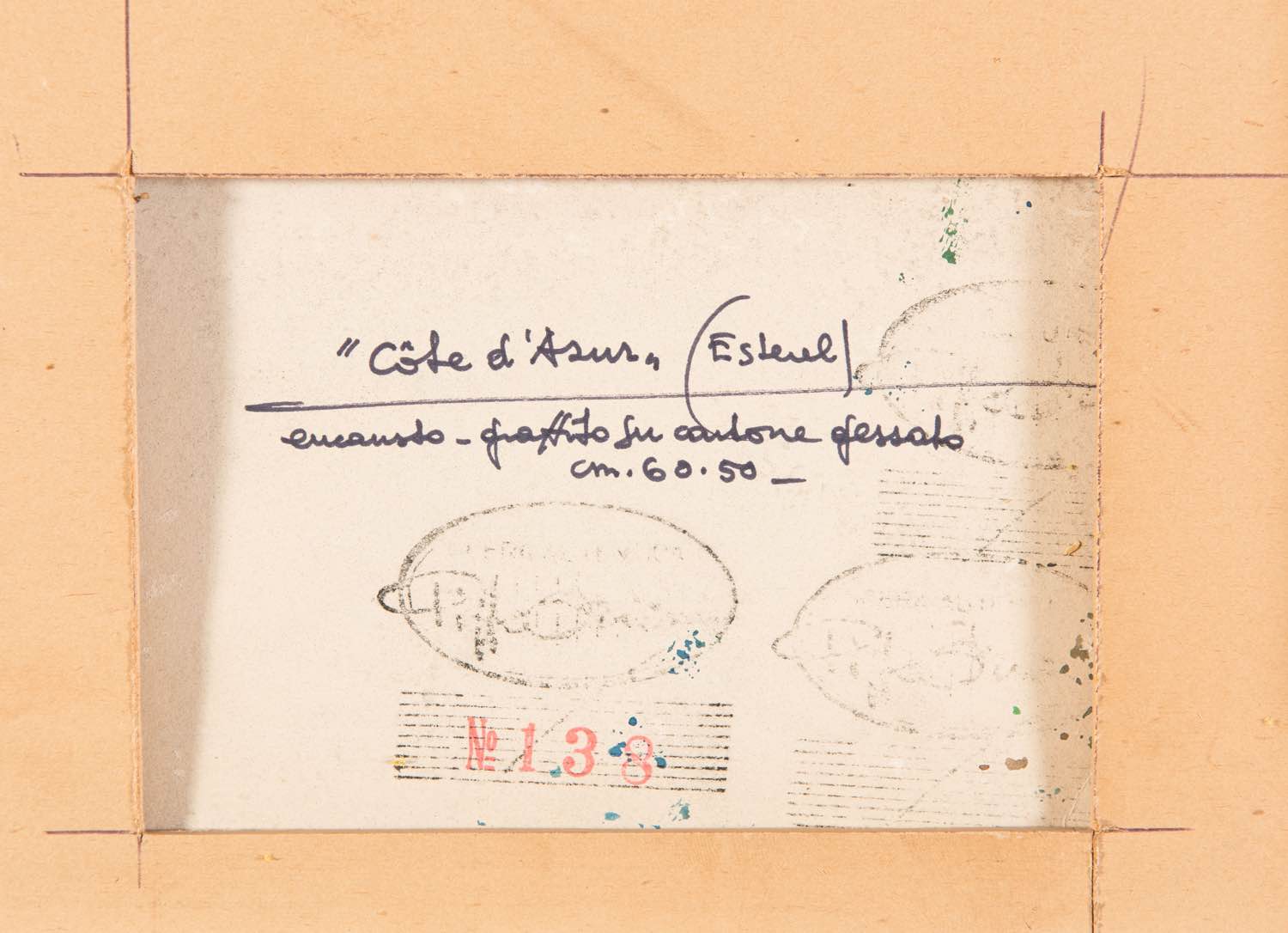 Encausto - graffito su cartone gessato, firmato in basso a destra Oriani, reca titolo ‘Cote d’Azur (Estérel)’, tecnica e misure al retro, H cm 50x60 Al retro reca timbro per autentica con firma Pippo Oriani e n. 138.