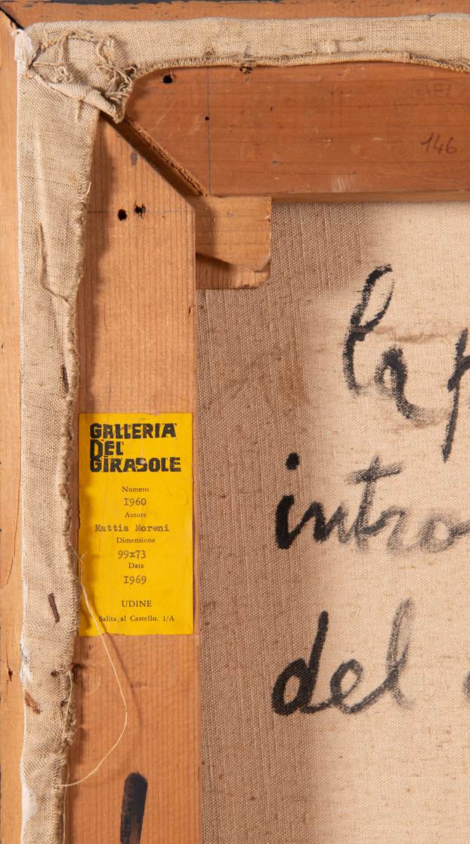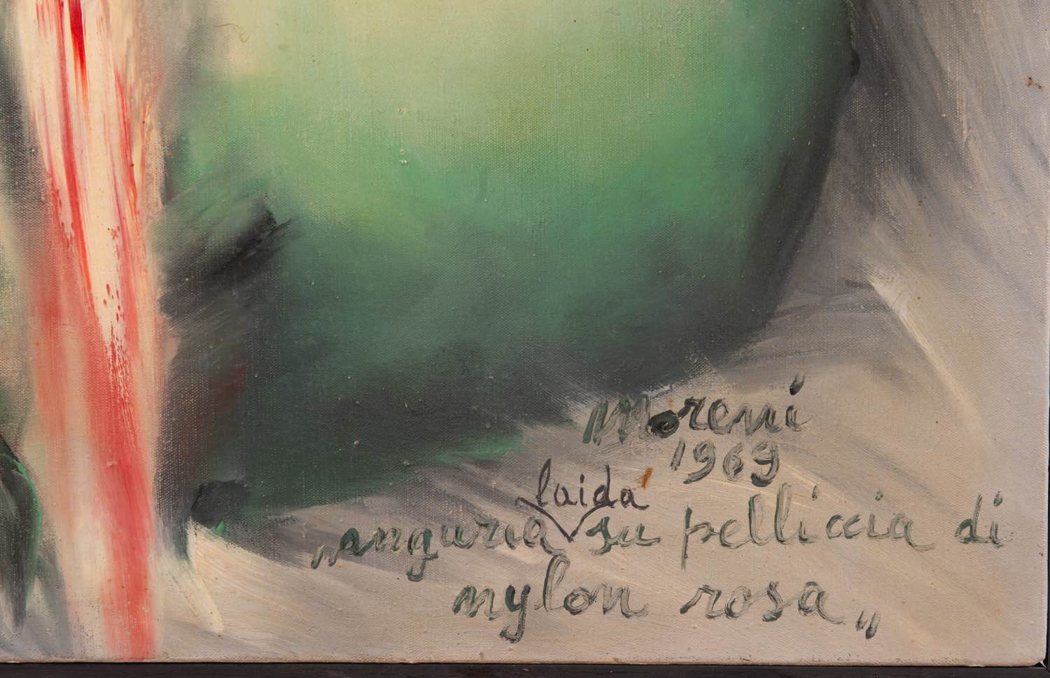 Olio su tela firmato E datato in basso a destra ‘Moreni 1969 anguria laida su pelliccia di nylon rosa’, al retro iscrizione ‘la prima anguria come introduzione alla “leggenda del complesso dell’oscenità”…. 100½x73½ / “anguria laida su pelliccia di nylon rosa” Mattia Moreni “Le Calbane Vecchie” 1969’, H cm 99.5x73 Al retro reca etichetta Galleria del Girasole - Udine, 1969. Bibliografia di riferimento: ‘Mattia Moreni. Catalogo Ragionato delle Opere. Dipinti 1934-1999’ a cura di GAM - Archivio Mattia Moreni, direzione scientifica di Enrico Crispolti - Silvana Editoriale - 2016, 4/1969/6, tav. 83. Provenienza: Collezione privata - Ravenna.