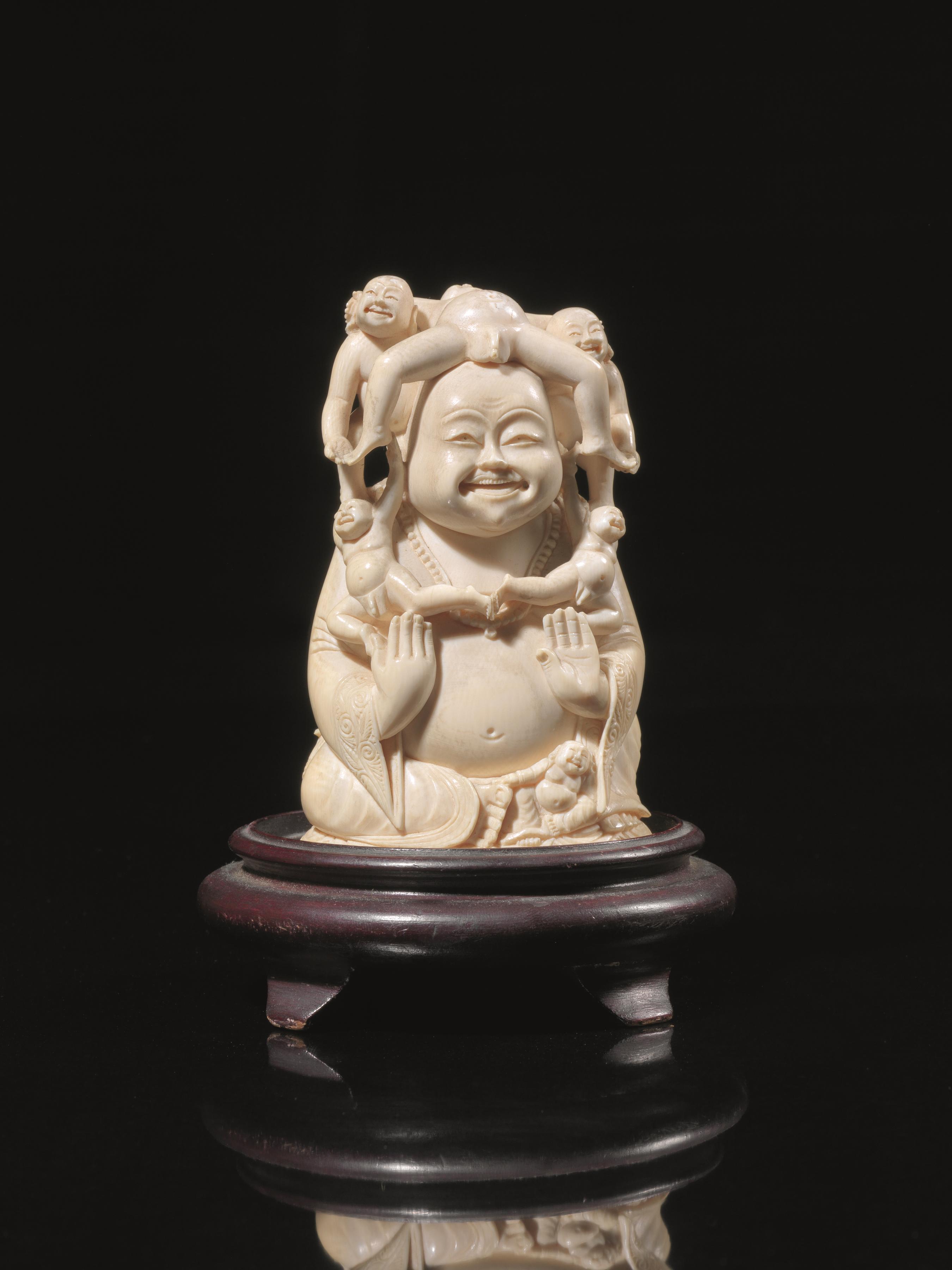 Intaglio, Cina sec. XIX - XX, in avorio raffigurante Buddha ridente sormontato da tanti Buddha bambino, alt. cm 11 su base in legno alt. cm 3