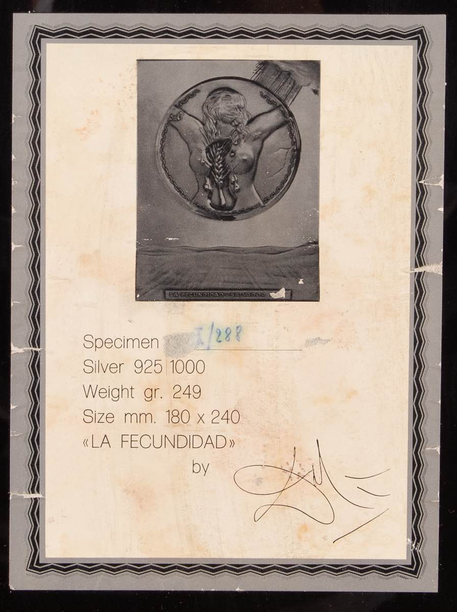 Bassorilievo su lastra d’argento 925/1000, iscrizione in basso ‘La Fecundidad - Salvador Dalì’, al retro numero di tiratura I/288 e firma Dalì, H mm 240x180
