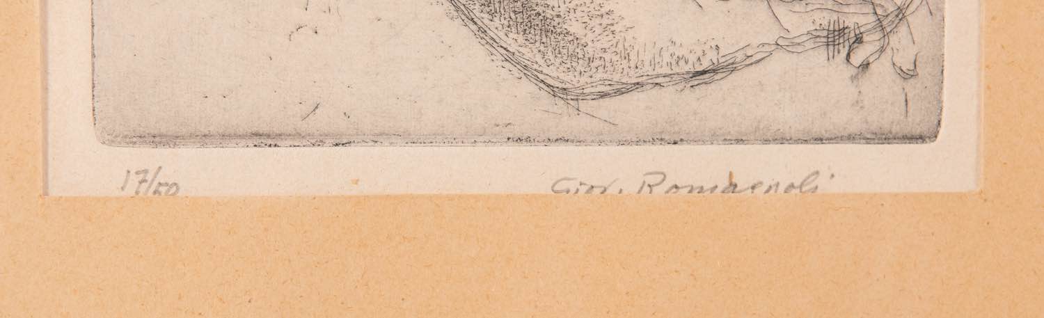Acquaforte su carta firmata in basso a destra Giov. Romagnoli, numero di tiratura in basso a sinistra 17/50, Lastra H cm 19.5x14