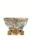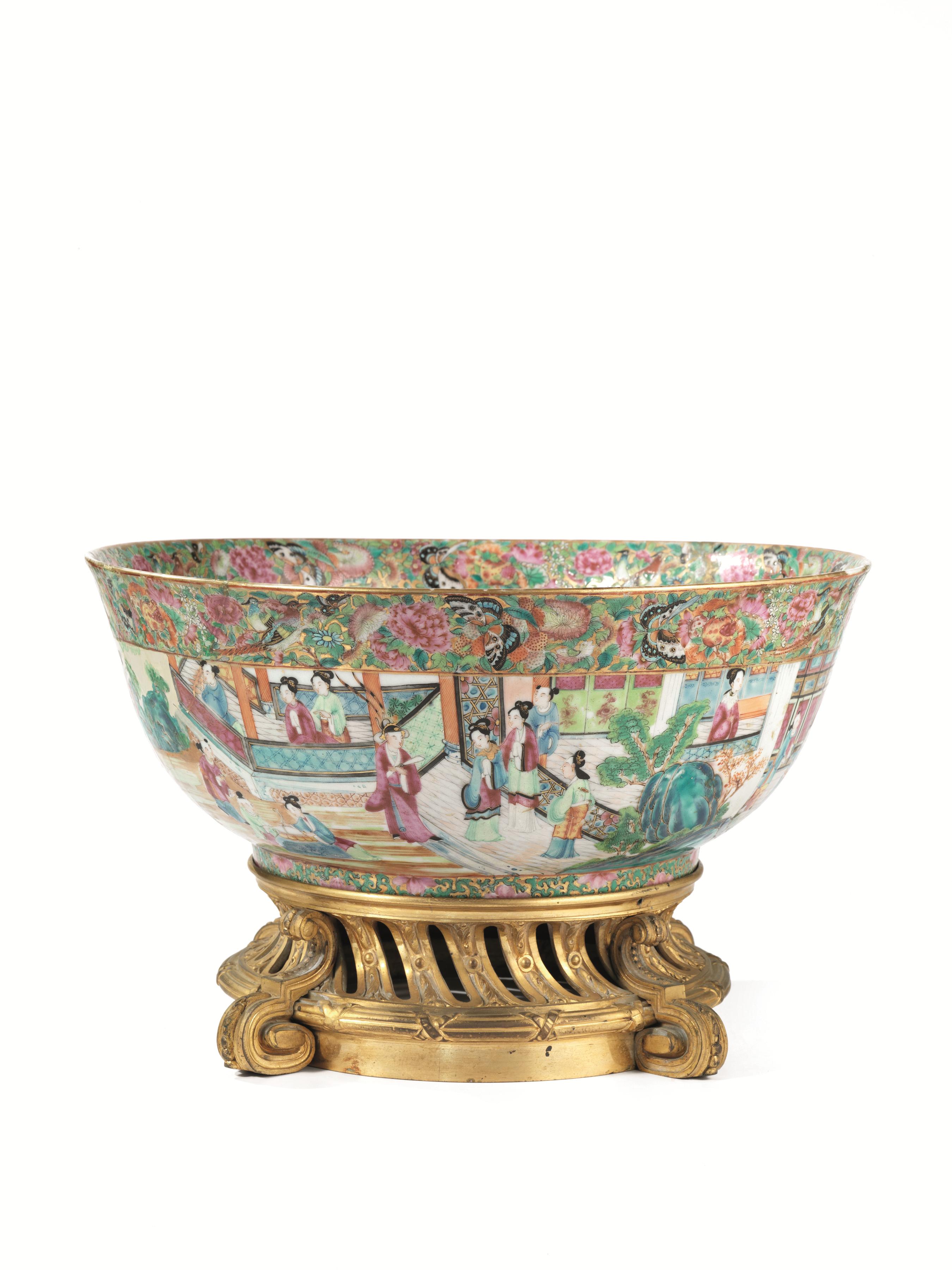 Bacile, manifattura di Canton, Cina, sec. XIX, in porcellana policroma decorato all’interno e all’esterno con larghi pannelli raffiguranti scene di corte, diam. cm 36, alt. cm 15 su base in metallo dorato alt. cm 8, danni e restauri