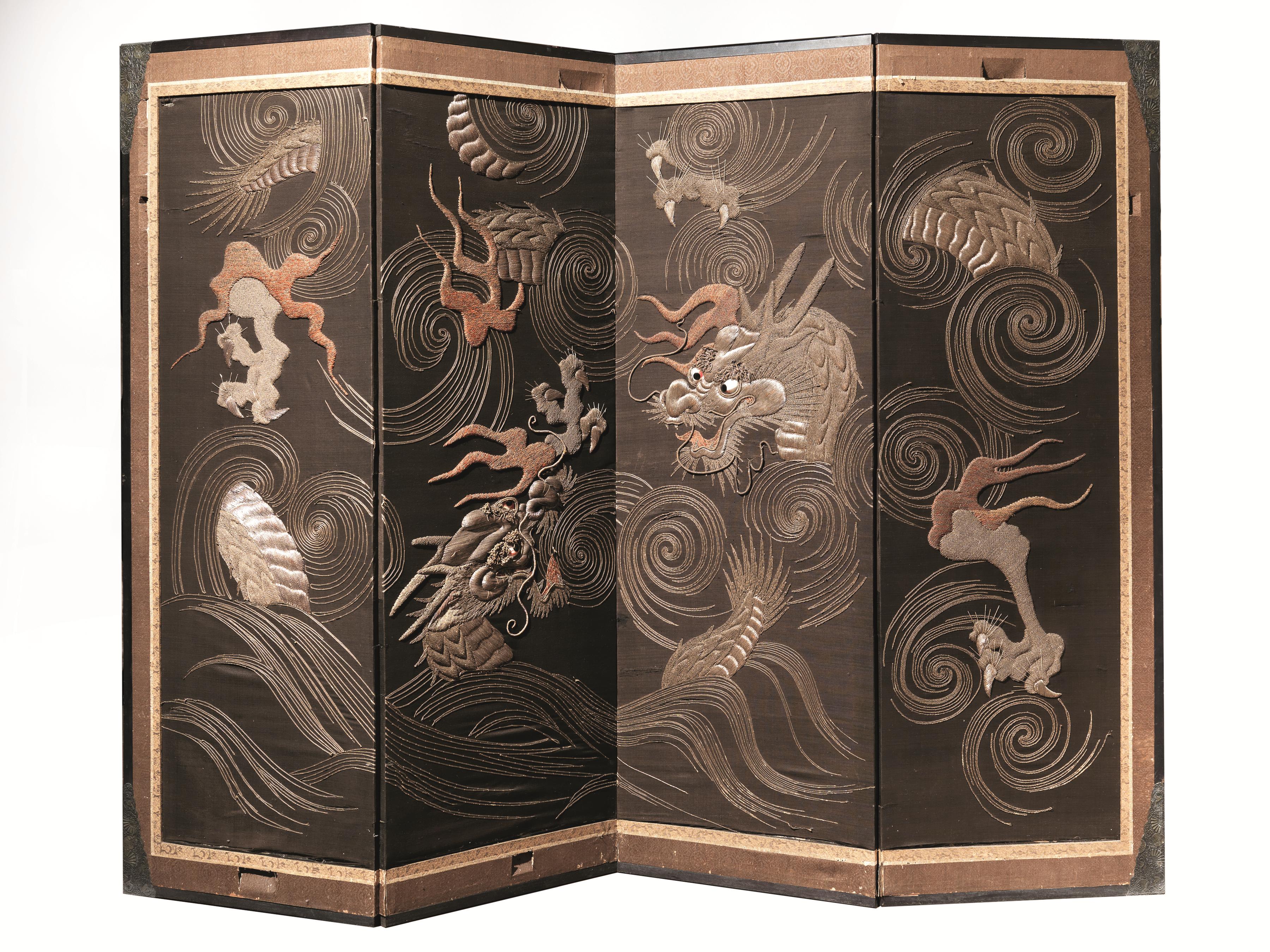 Paravento, Cina sec. XIX-XX, a quattro ante in tessuto riportato su pannelli e decorato con ricami in fili di seta dorati e argentati raffiguranti grandi draghi tra le nuvole, cm 200x140, lievi danni