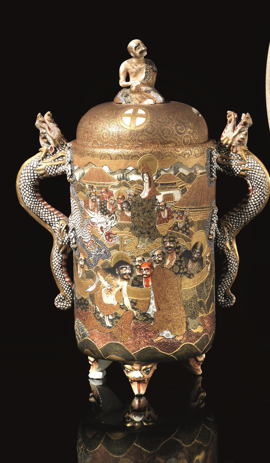 Contenitore, Giappone sec. XIX-XX, in porcellana satsuma sui tono dell’oro, dalla forma cilindrica, due manici laterali a for- ma di drago e il pomello del coperchio modellato della forma di un saggio assiso, alt. cm 27, sbeccature all’interno del coperchio