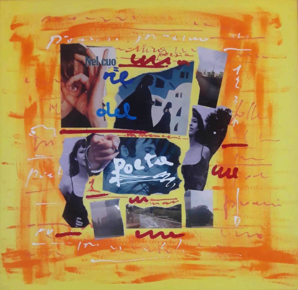 MARCUCCI LUCIA Firenze 1933 “Nel cuore del poeta” acrilico e collage su tela cm 82x82 del 1997. Sul retro titolo, data, tecnica e firma. Opera pubblicata a pag.184 del catalogo generale di “Lucia Marcucci”” volume I°, opere dal 1961-2011.