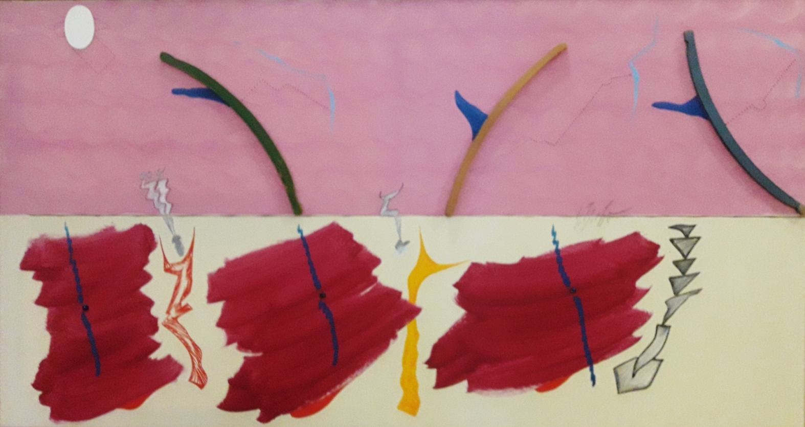 DANGELO SERGIO Milano 1932 “Demoni e aquiloni” acrilico, collage e applicazioni di oggetti, dittico cm 150x100 (due tele di cm 150x40 l’una)del1985. Firmato sul fronte al centro nel mezzo. Sul retro titolo e anno. Si ringrazia il maestro per la conferma e l’autentica su foto.