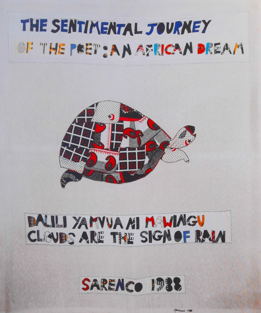 SARENCO (ISAIA MABELLINI) Brescia 1945-2017“The sentimental Journey of the poet” patchwork su tela cm 260x220 del 1988. Firmata e datata sul fronte in basso a destra. Sul retro firma. Opera pubblicata a pag. 156 del catalogo ragionato” Opere di Sarenco” Volume I a cura di Achille Benito Oliva.