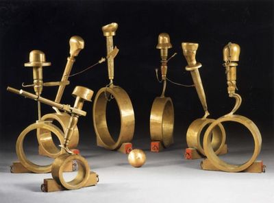 SPOERRI DANIEL Romania 1930 “I giocolieri”: Poet, Priest, Hunted Man, Dandy, Lady, Rider, Ball” bronzi in patina oro del 1985, installazione 8x8 m. Opere pubblicate da pag 81 a pag.89 del catalogo “Daniel Spoerri” di Henry Martin, Rara International editore. Opera esposta al museo “ Beauburg” di Parigi 2017-2018.
