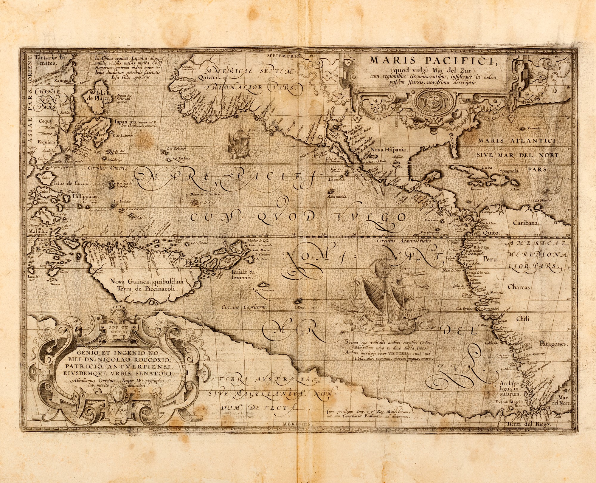 Incisione su rame, [1595], mm. 565 x 460 il foglio, con 2 cartigli, uno con la data del 1589, due galeoni, nella zona mare, con la descrizione dettagliata della Victoria , la nave Ammiraglia di Magellano, al verso testo in latino, restauri e lacune in risarcite.